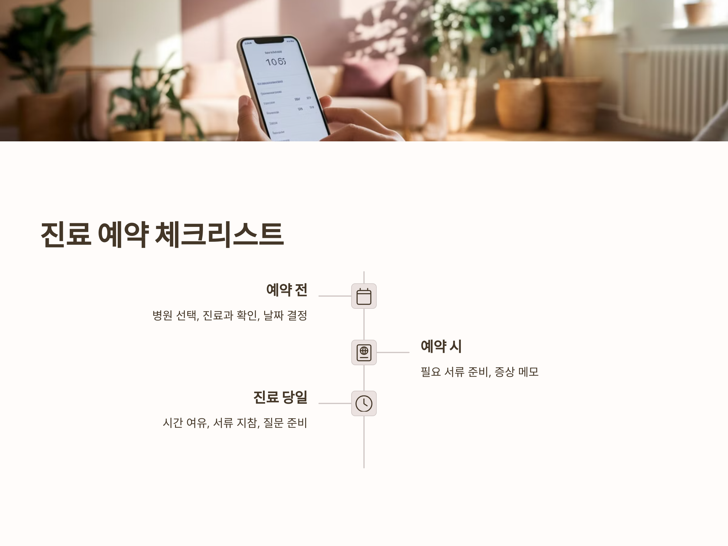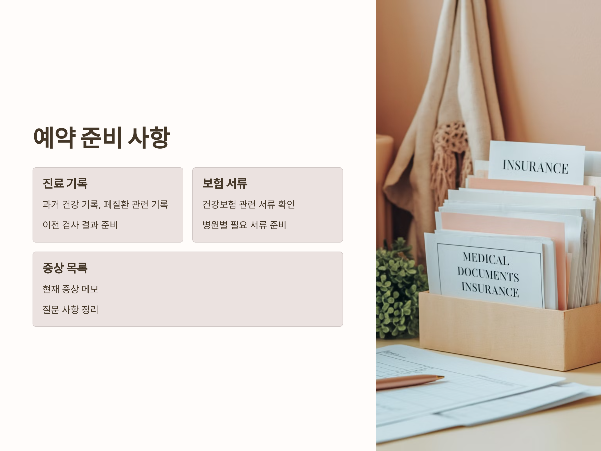 늑막염 진료 예약 시, 몇 가지 준비 사항을 체크리스트로 정리하여 두는 것이 좋습니다. 미리 준비하면 진료 당일 불필요한 지연을 피할 수 있습니다.