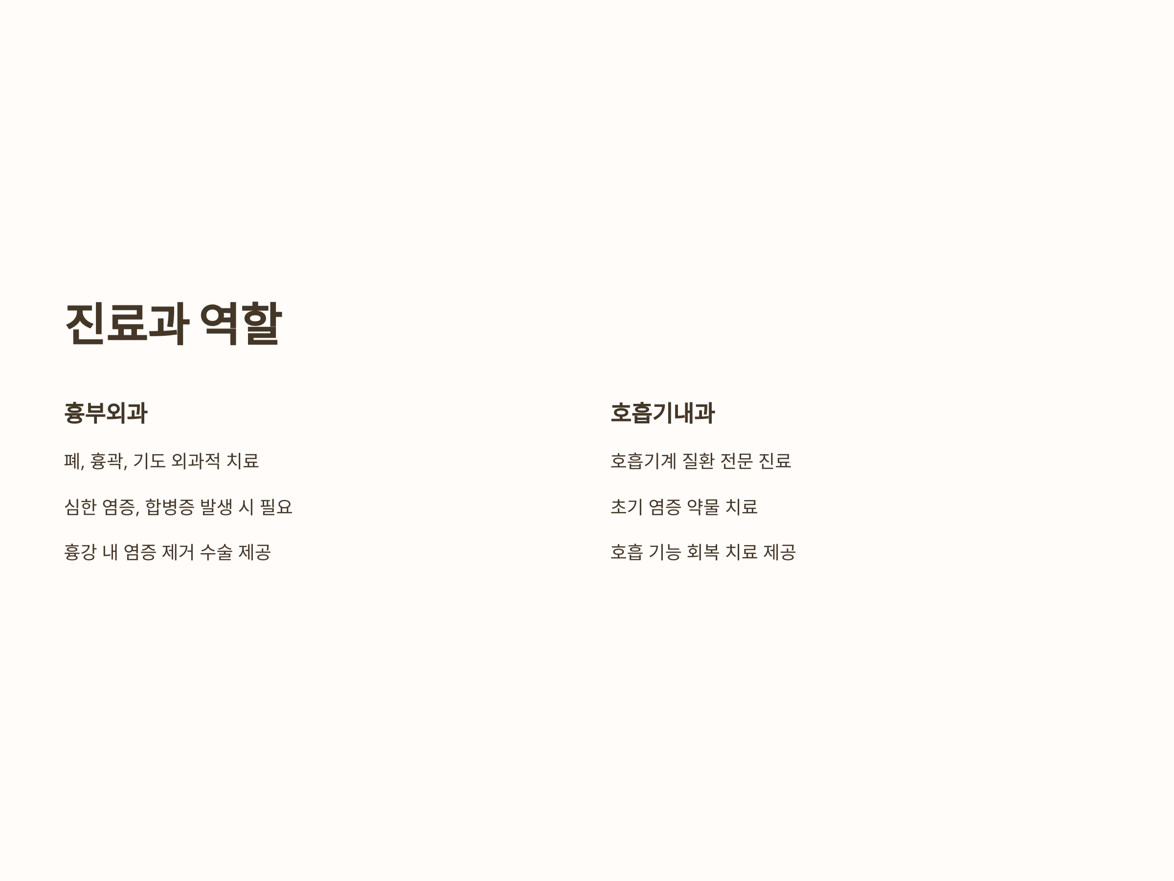 호흡기내과는 호흡기계 질환을 전문적으로 다루는 과입니다. 늑막염 초기나 염증이 가벼운 경우에는 호흡기내과에서 약물 치료를 통해 염증을 가라앉히는 방법을 우선적으로 시도할 수 있습니다. 또한 호흡기내과에서는 염증의 원인인 감염이나 다른 질환을 치료하고, 호흡 기능 회복을 위한 다양한 치료 방법을 제공합니다.