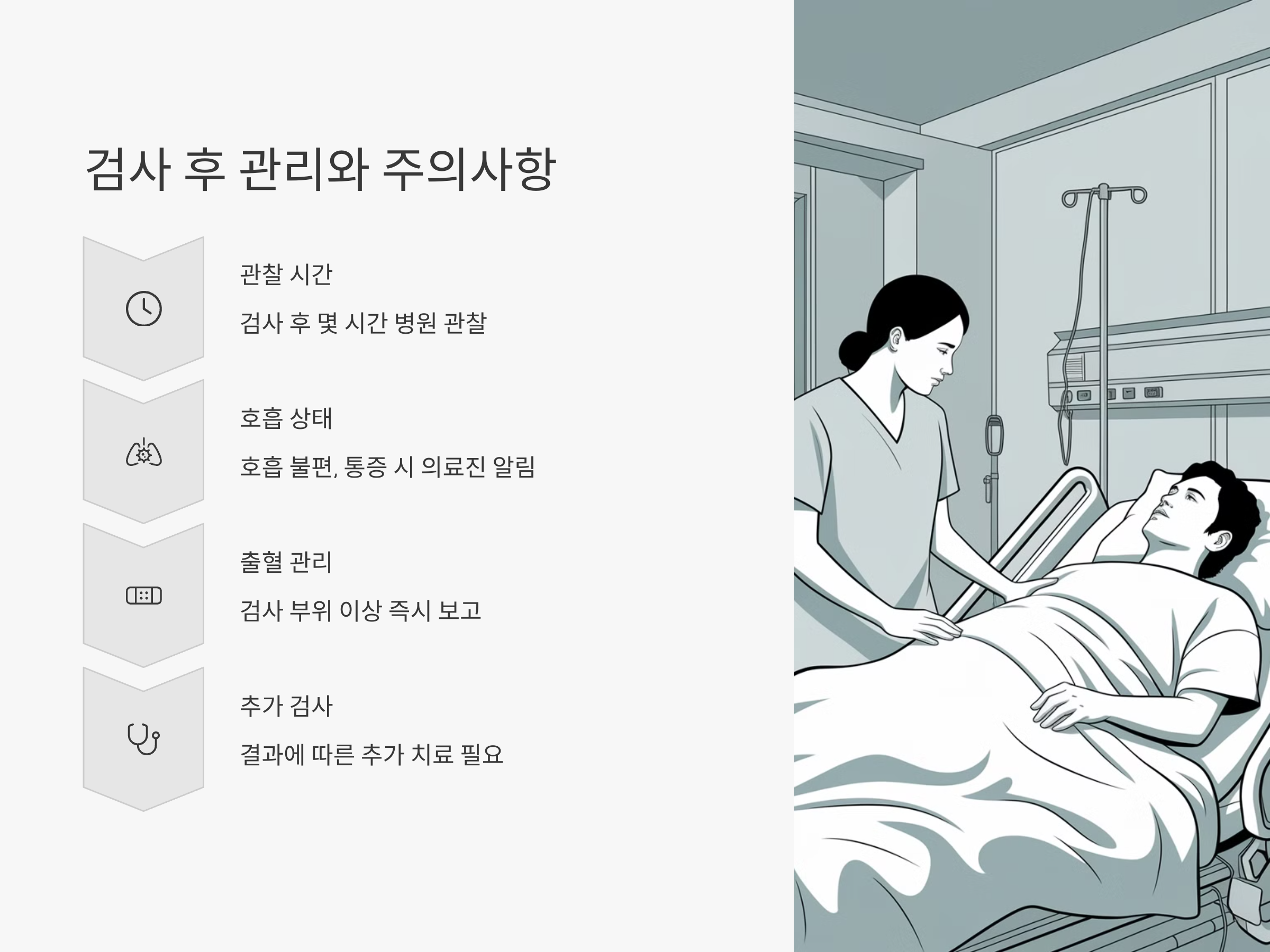 - 호흡 상태 점검: 흉강천자 검사 후 호흡이 불편하거나 통증이 심해지면 즉시 의료진에게 알려야 합니다.