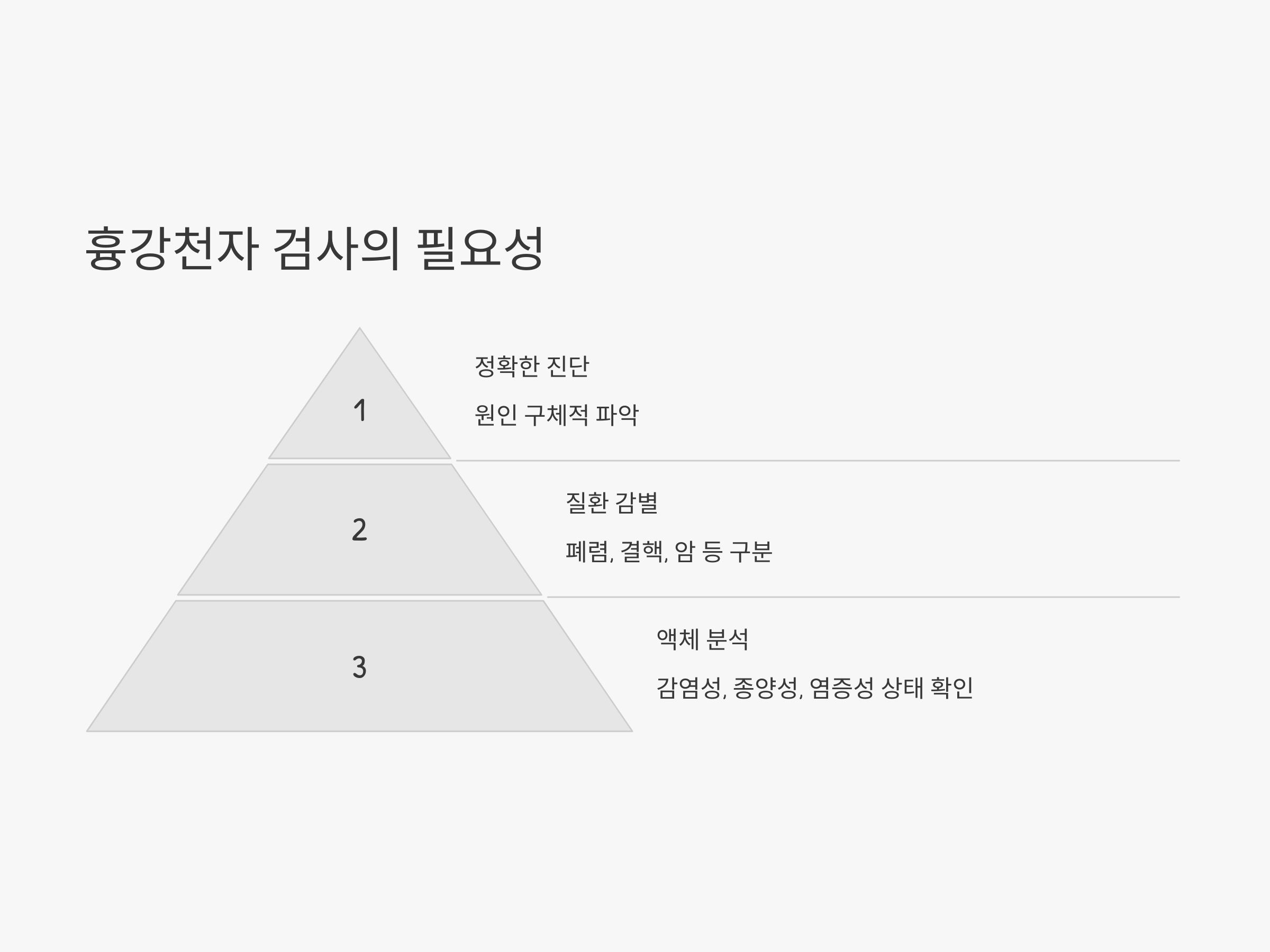 흉강천자 검사는 늑막염을 진단할 뿐만 아니라, 흉강 내의 이상을 발견하고 그 원인을 구체적으로 파악하는 데 매우 중요합니다. 예를 들어, 만약 흉강 내에 흉수가 고여 있다면 이를 통해 폐렴이나 결핵, 암 등이 원인일 수 있음을 알 수 있습니다. 또한, 흉강천자 검사로 액체의 성질을 분석하여, 감염성, 종양성 또는 염증성 상태를 구분할 수 있습니다.