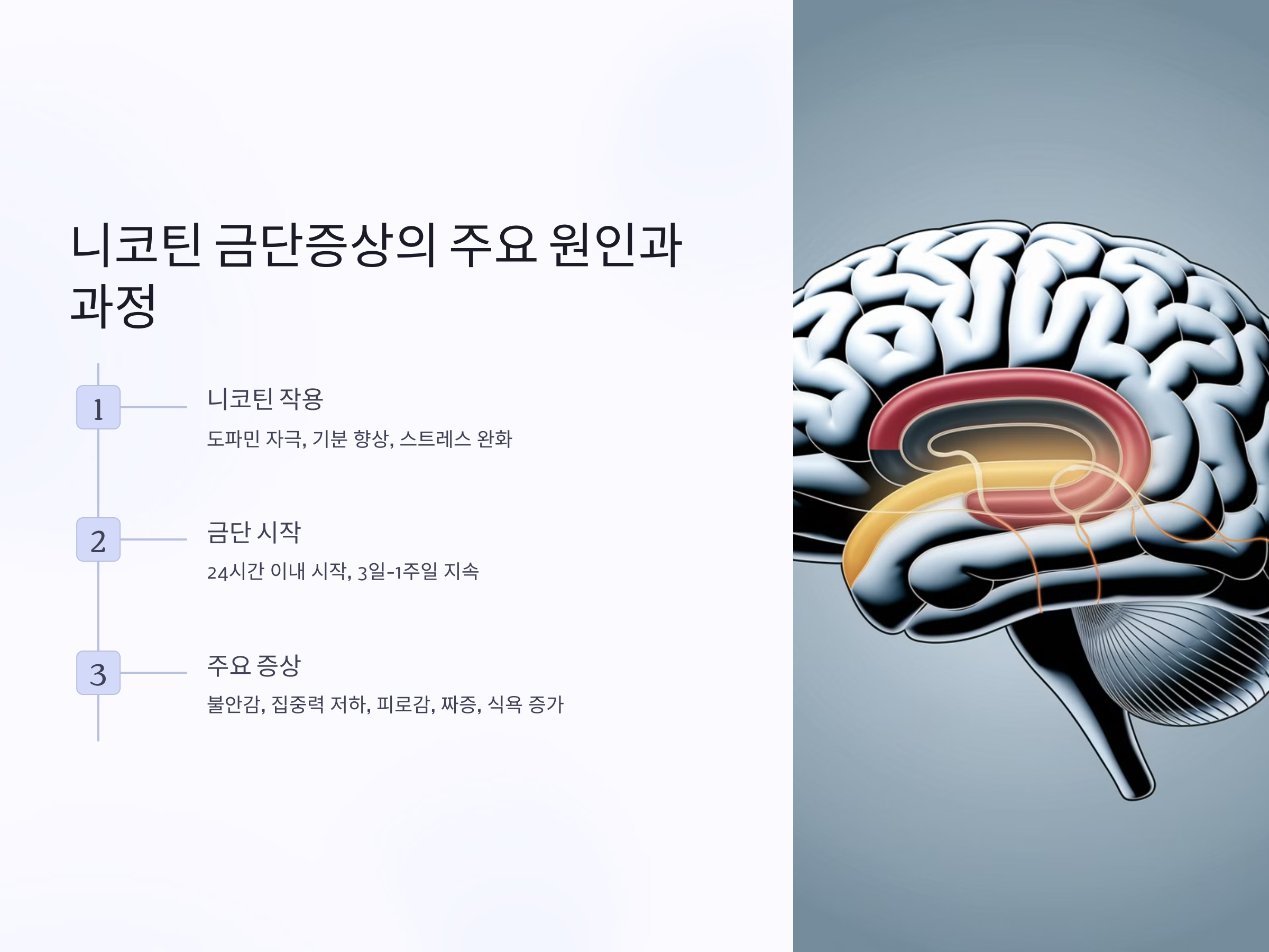 니코틴은 뇌에서 도파민을 자극하여 기분을 좋게 하고, 스트레스를 완화시켜주는 효과가 있습니다. 그러나 니코틴을 갑자기 중단하면 뇌는 이 변화에 적응해야 하며, 그로 인해 불안감과 집중력 저하가 나타납니다. 금단 증상은 보통 금연을 시작한 후 24시간 이내에 시작되며, 3일에서 1주일 정도 지속될 수 있습니다. 이 시기의 증상들은 매우 강하게 느껴지기 때문에, 적절한 대처가 필요합니다.