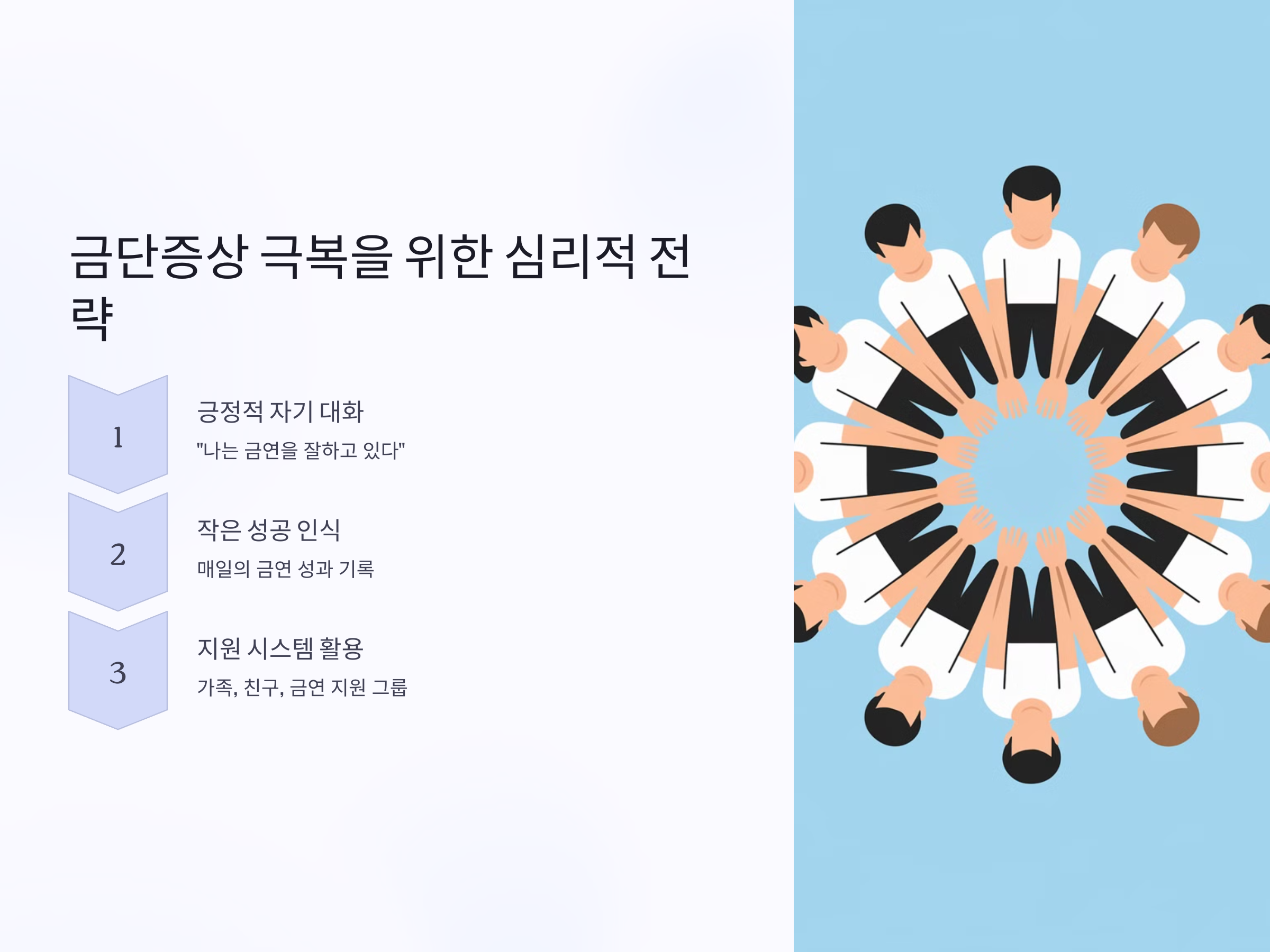 가족이나 친구들, 또는 금연 지원 그룹과 함께 금연을 이어가는 것이 매우 중요합니다. 이들의 응원과 지원은 심리적으로 큰 힘이 됩니다. 함께 금연을 시도하는 사람들과 경험을 나누면 더 효과적으로 금단증상을 관리할 수 있습니다.
