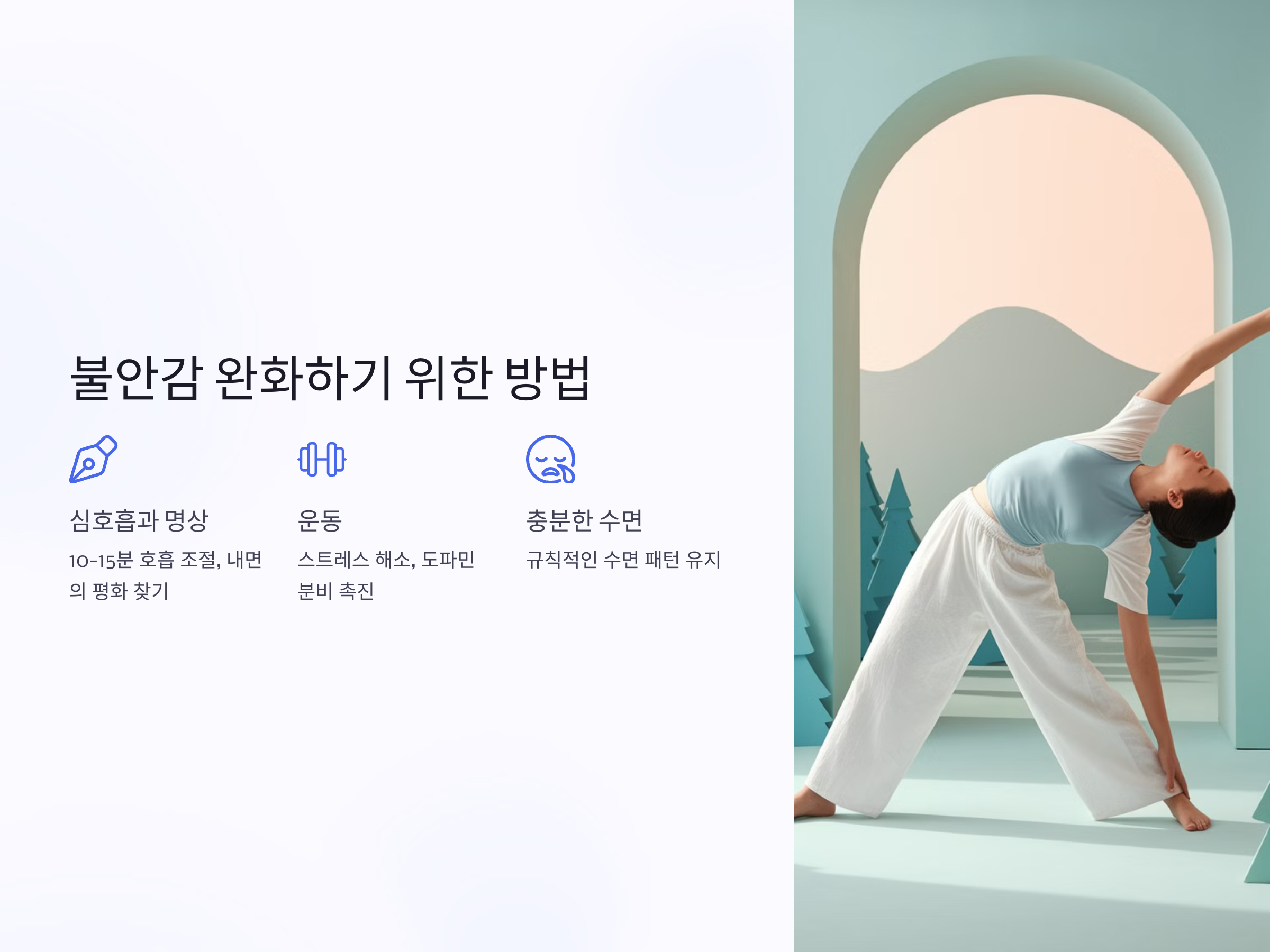 심호흡, 명상, 운동 등 다양한 방법으로 불안감을 완화할 수 있습니다.