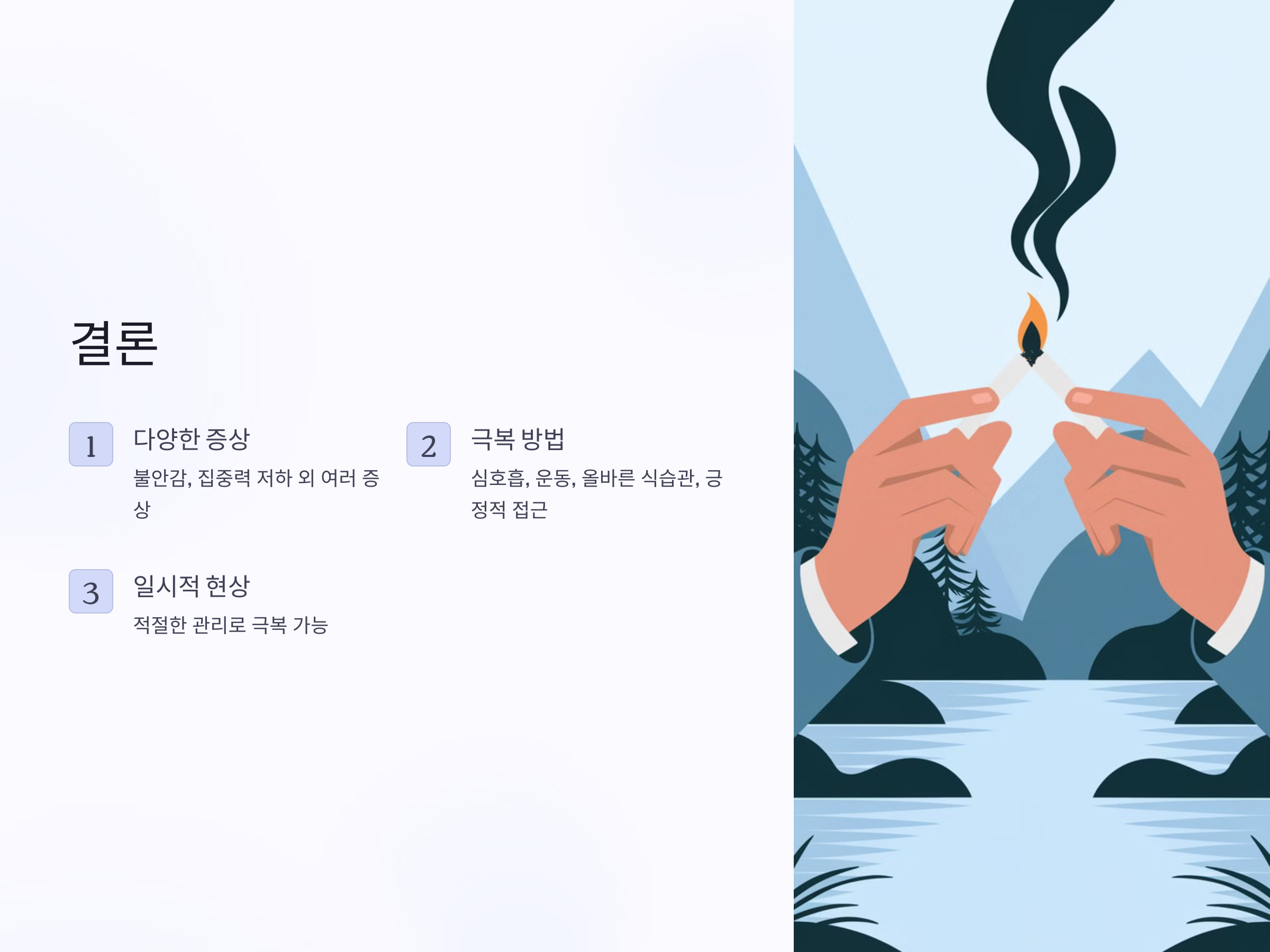 니코틴 금단증상은 불안감과 집중력 저하 외에도 다양한 증상을 유발할 수 있습니다. 그러나 이를 극복하는 방법은 충분히 존재하며, 적절한 대처로 금연을 성공적으로 이어갈 수 있습니다. 금연 초기에는 불안감과 집중력 저하가 일시적으로 나타날 수 있지만, 이를 충분히 관리할 수 있는 방법들이 많습니다. 심호흡, 운동, 올바른 식습관, 그리고 긍정적인 심리적 접근을 통해 금단증상을 완화하고, 금연의 길을 걸어가세요.