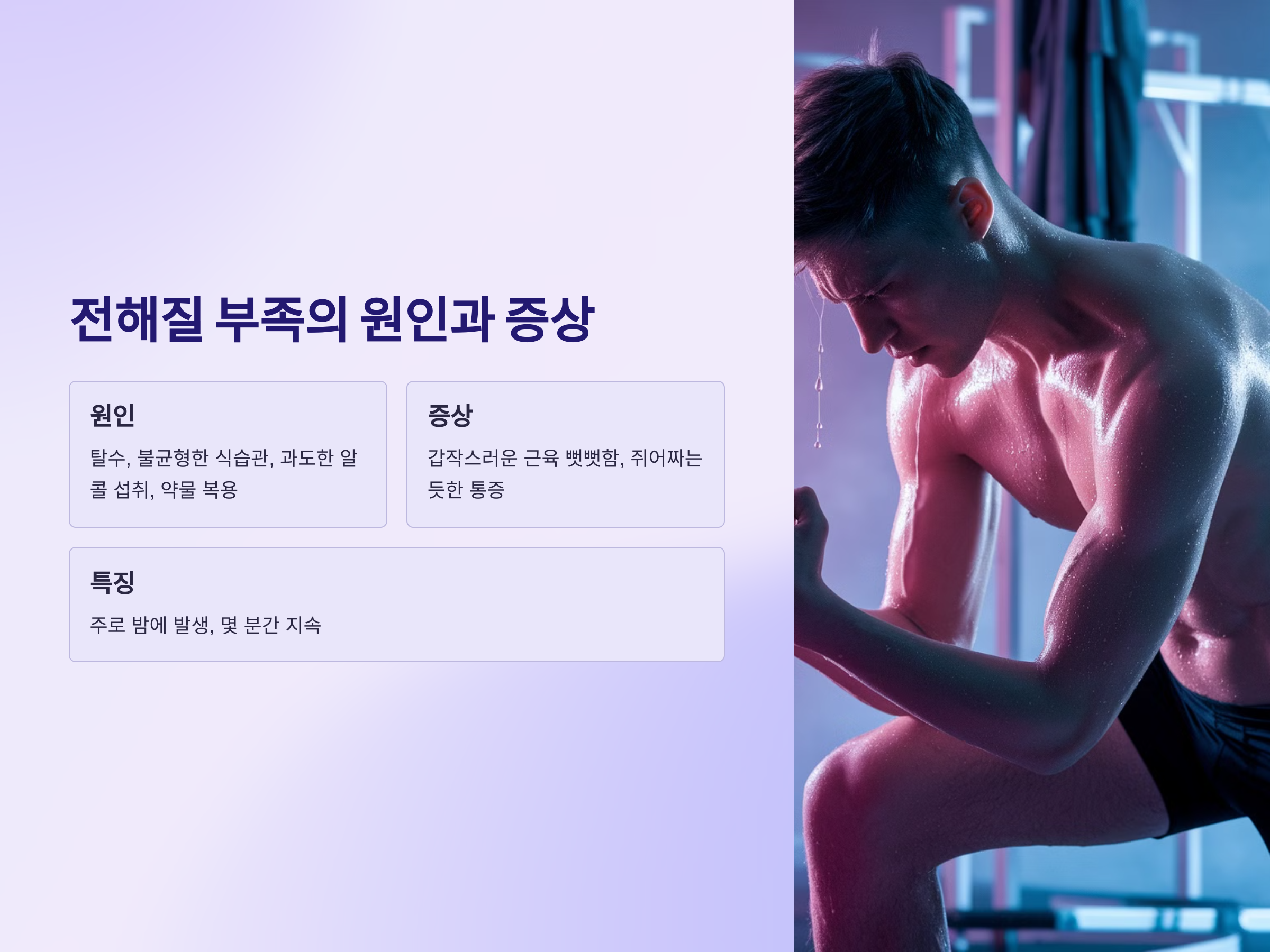 전해질 부족으로 인한 경련은 일반적으로 갑작스러운 근육의 뻣뻣함이나 팔꿈치, 무릎 등 특정 부위에서 쥐어짜는 듯한 통증으로 나타납니다. 이러한 경련은 종종 밤에 발생하며, 몇 분간 지속되기도 합니다. 또한 경련이 지나고 나면 근육이 일시적으로 약해지는 느낌이 들 수 있습니다.