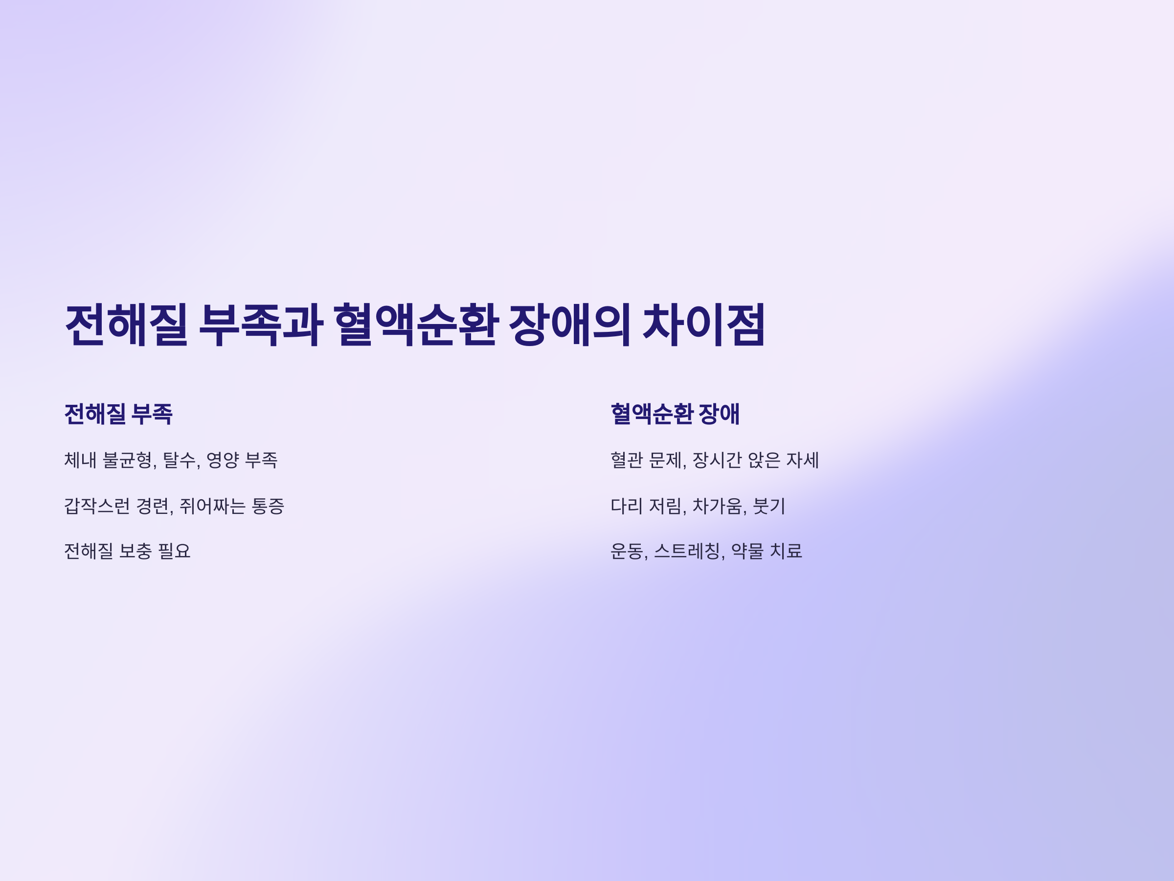 전해질 부족과 혈액순환 장애는 모두 다리 경련의 주요 원인으로 작용할 수 있지만, 그 원인과 증상에서 중요한 차이가 있습니다.