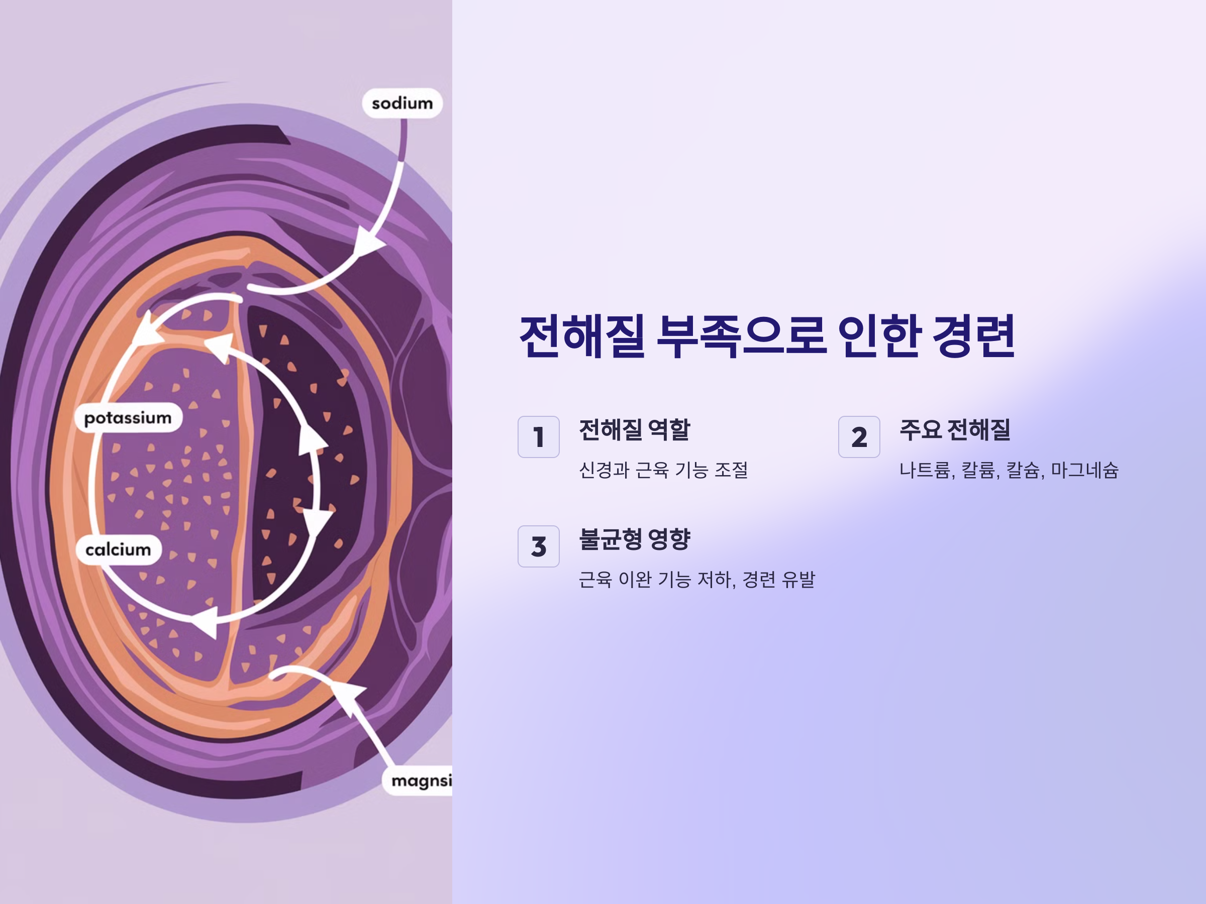 전해질은 신경과 근육 기능을 조절하는 데 중요한 역할을 합니다. 주요 전해질로는 나트륨, 칼륨, 칼슘, 마그네슘 등이 있으며, 이들은 체내의 물질대사와 근육의 수축 및 이완을 조절합니다. 만약 전해질의 균형이 깨지게 되면 근육이 제때 이완되지 않아 경련이 발생할 수 있습니다.