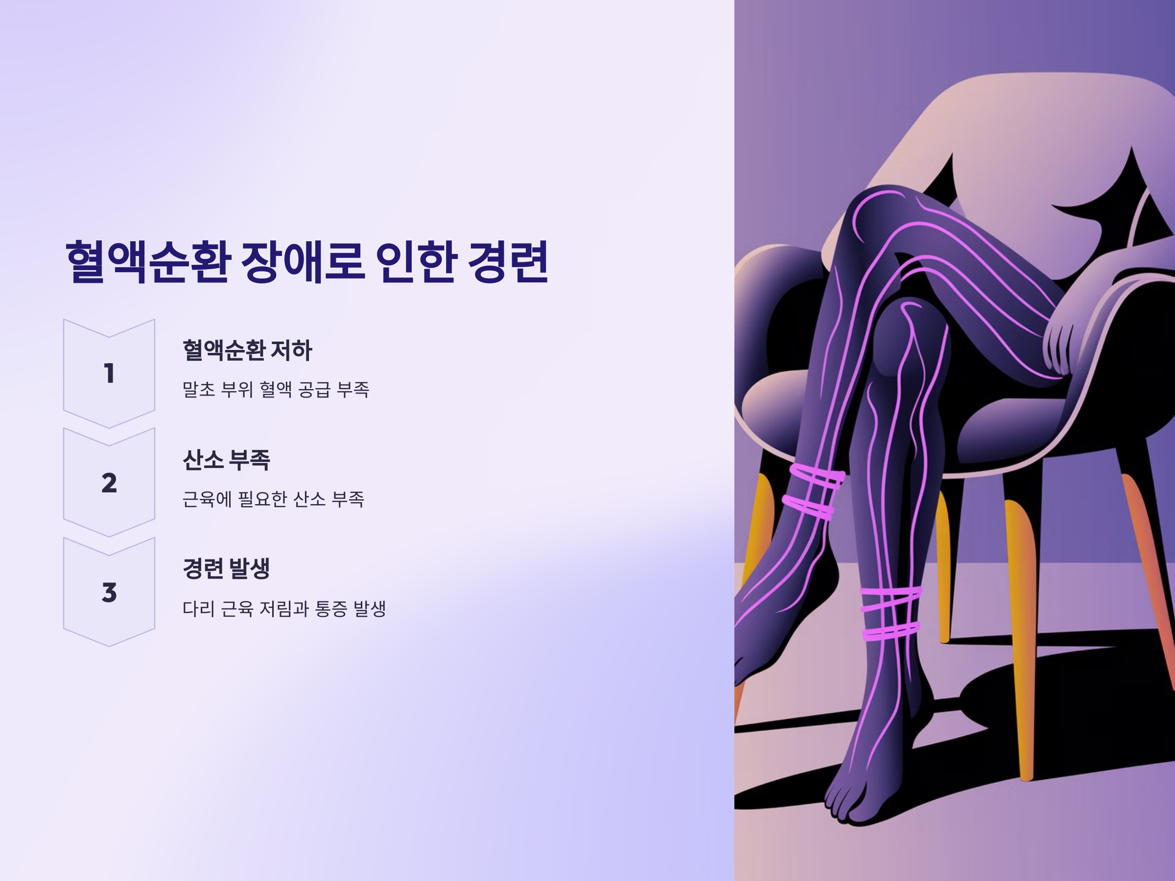 혈액순환 장애는 혈액이 신체의 주요 부위에 적절히 공급되지 못하게 되는 상태를 말합니다. 다리와 같은 말초 부위의 혈액순환이 잘 되지 않으면, 근육에 필요한 산소와 영양분이 제대로 공급되지 않아 경련이 발생할 수 있습니다.