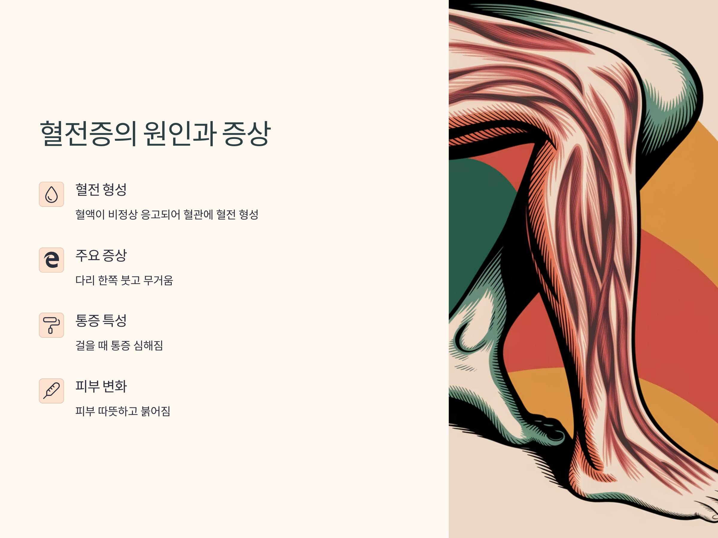 혈전증은 혈액이 비정상적으로 응고되어 혈관에 혈전을 형성하는 질환입니다. 특히 심부정맥혈전증(DVT) 은 다리 깊은 정맥에 혈전이 생기면서 통증과 붓기를 유발합니다. 혈전이 생기면 혈류가 막혀서 혈액이 원활하게 흐르지 않게 되는데, 이로 인해 다리의 부종과 통증이 발생할 수 있습니다. 혈전증의 주요 증상으로는 다음과 같은 것들이 있습니다: