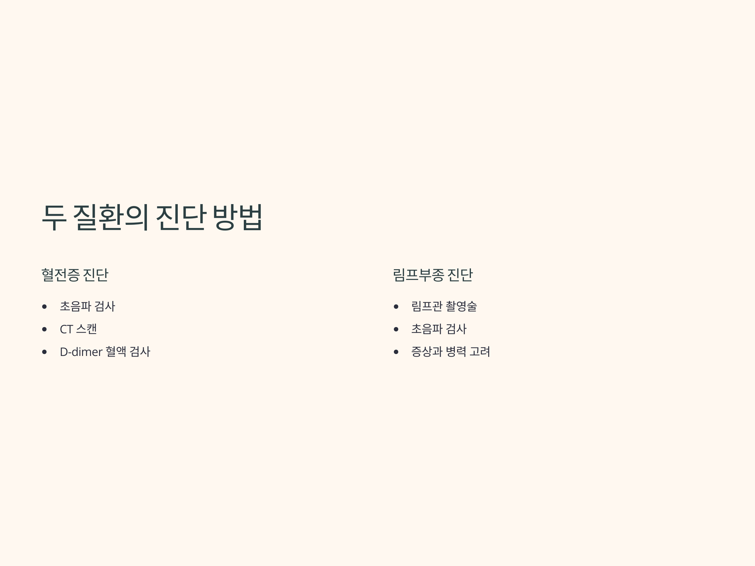 혈전증과 림프부종은 그 증상에서 일부 유사성을 보일 수 있지만, 정확한 진단을 통해 차이를 구별할 수 있습니다. 각각의 질환은 다르게 진단되며, 각기 다른 치료법이 필요합니다.