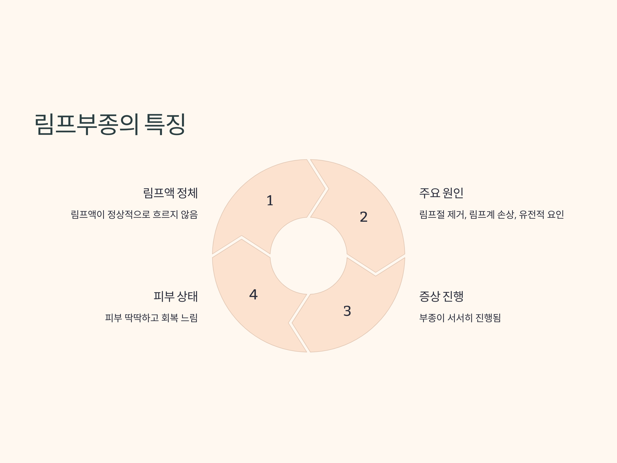 - 림프절 제거: 수술이나 암 치료로 인해 림프절이 제거되면 림프액이 제대로 흐르지 않음.