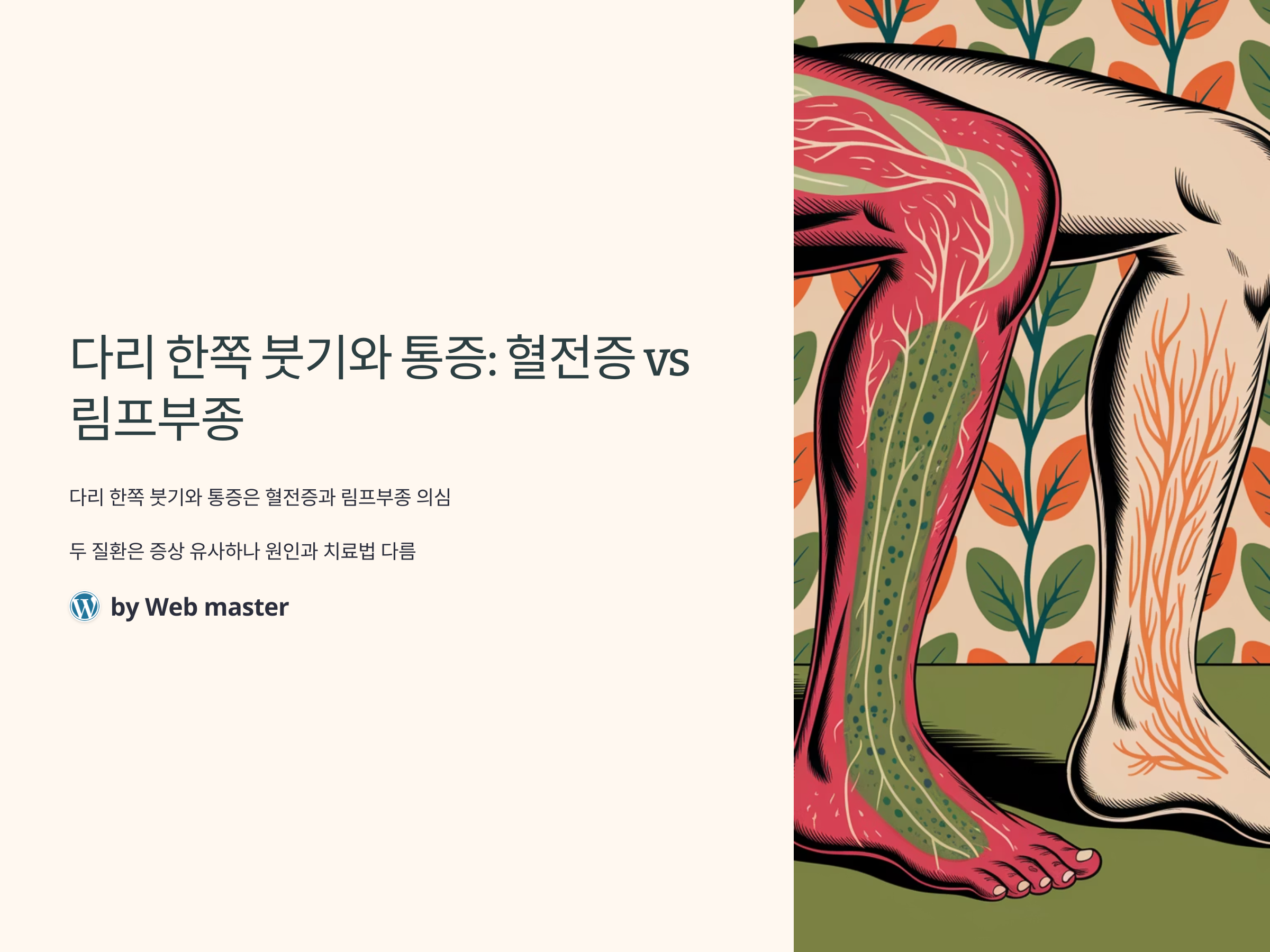 다리 한쪽이 붓고 걸을 때 통증이 심하다면, 혈전증과 림프부종을 의심할 수 있습니다. 두 질환은 모두 다리의 붓기와 통증을 유발하지만, 원인과 치료법이 크게 다릅니다. 이 글에서는 혈전증과 림프부종의 차이점, 증상, 진단 방법, 그리고 치료법에 대해 다루어 보겠습니다.