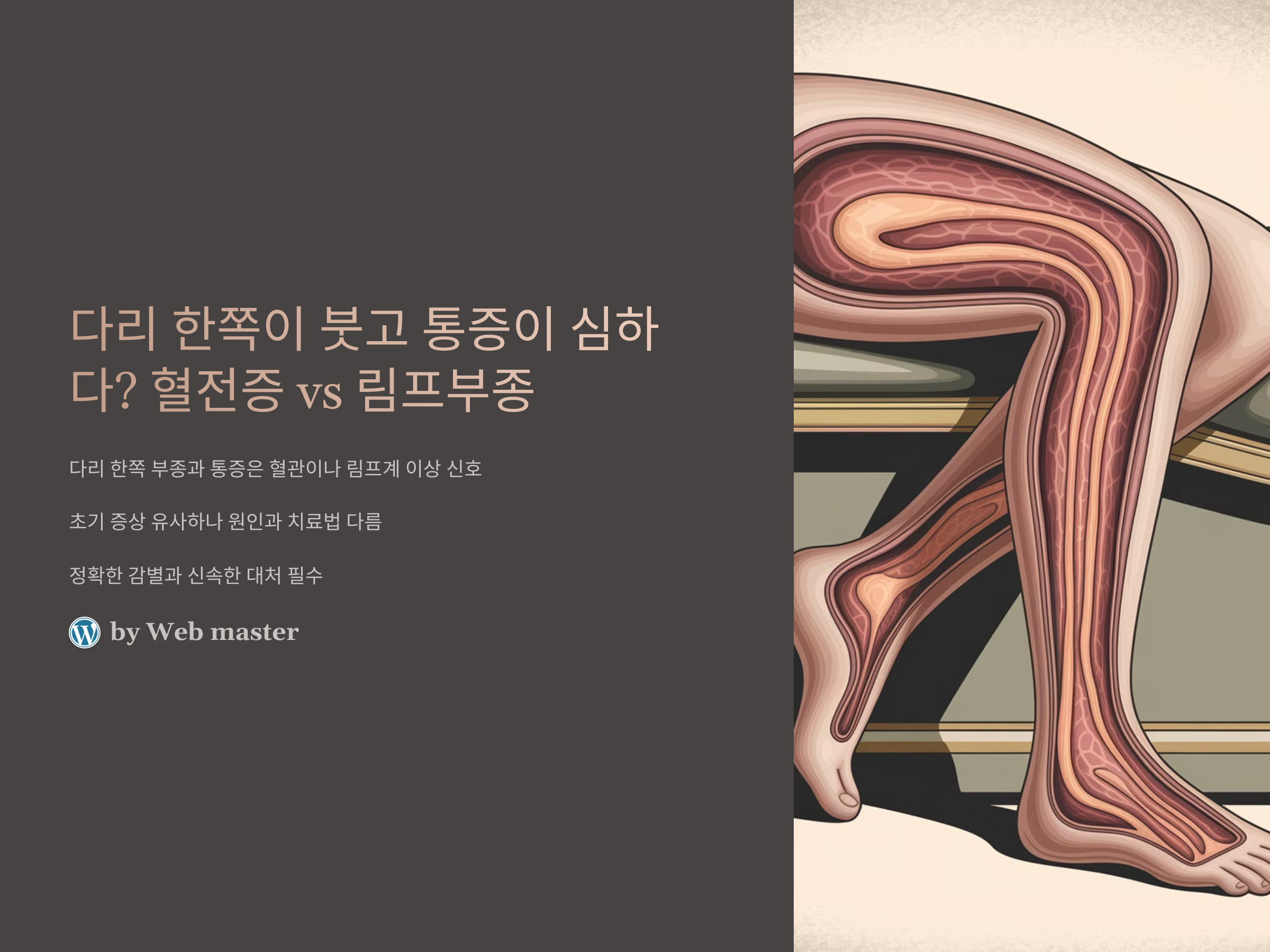 다리 한쪽이 부어오르고 걷기조차 힘들 정도로 통증이 심하다면 혈관이나 림프계 이상을 의심해야 합니다. 특히 심부정맥 혈전증(DVT)과 림프부종은 초기 증상이 유사하지만 원인과 치료법이 전혀 다릅니다. 혈전증은 즉시 치료하지 않으면 폐색전증 같은 생명을 위협하는 합병증으로 발전할 수 있으며, 림프부종은 만성적으로 진행될 경우 심각한 조직 손상을 초래할 수 있습니다. 따라서 정확한 감별과 신속한 대처가 필수적입니다. 이번 글에서는 혈전증과 림프부종의 차이점, 증상, 원인, 치료법 등을 비교 분석하여 적절한 대응 방법을 안내해 드리겠습니다.