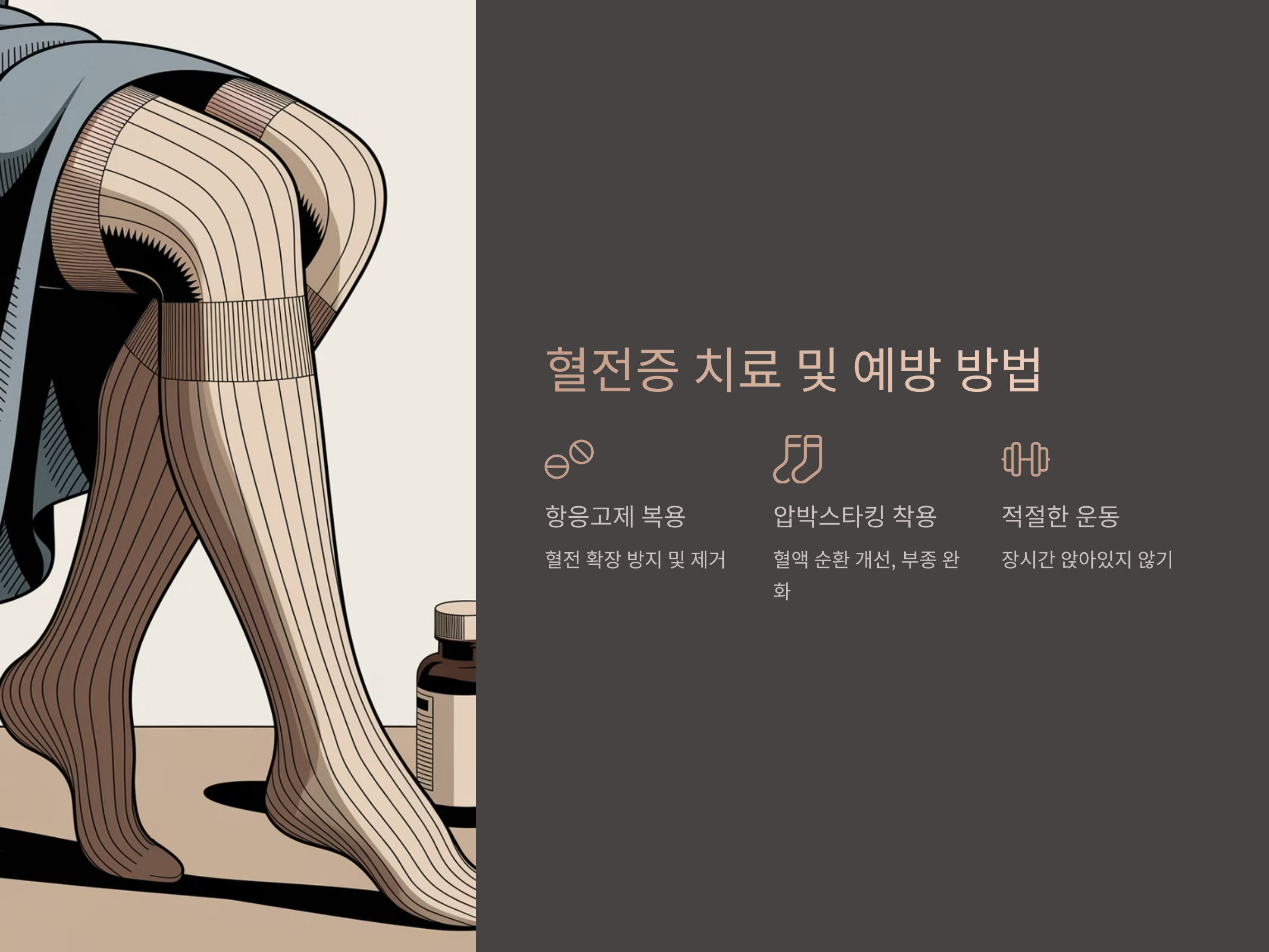 - 항응고제 복용: 혈전 확장을 막고 제거하는 역할