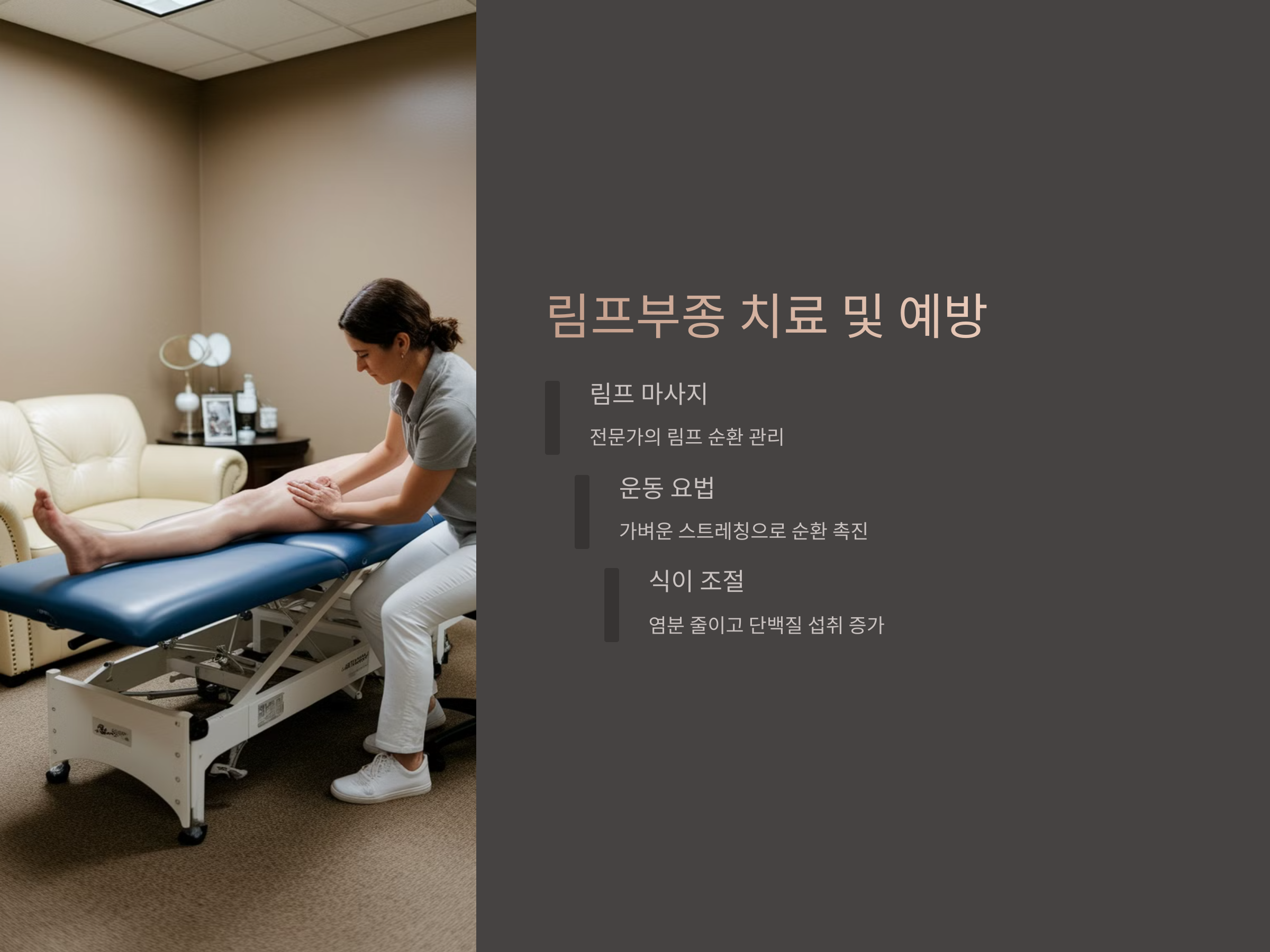 - 림프 마사지: 림프 순환을 돕기 위해 전문가의 관리 필요