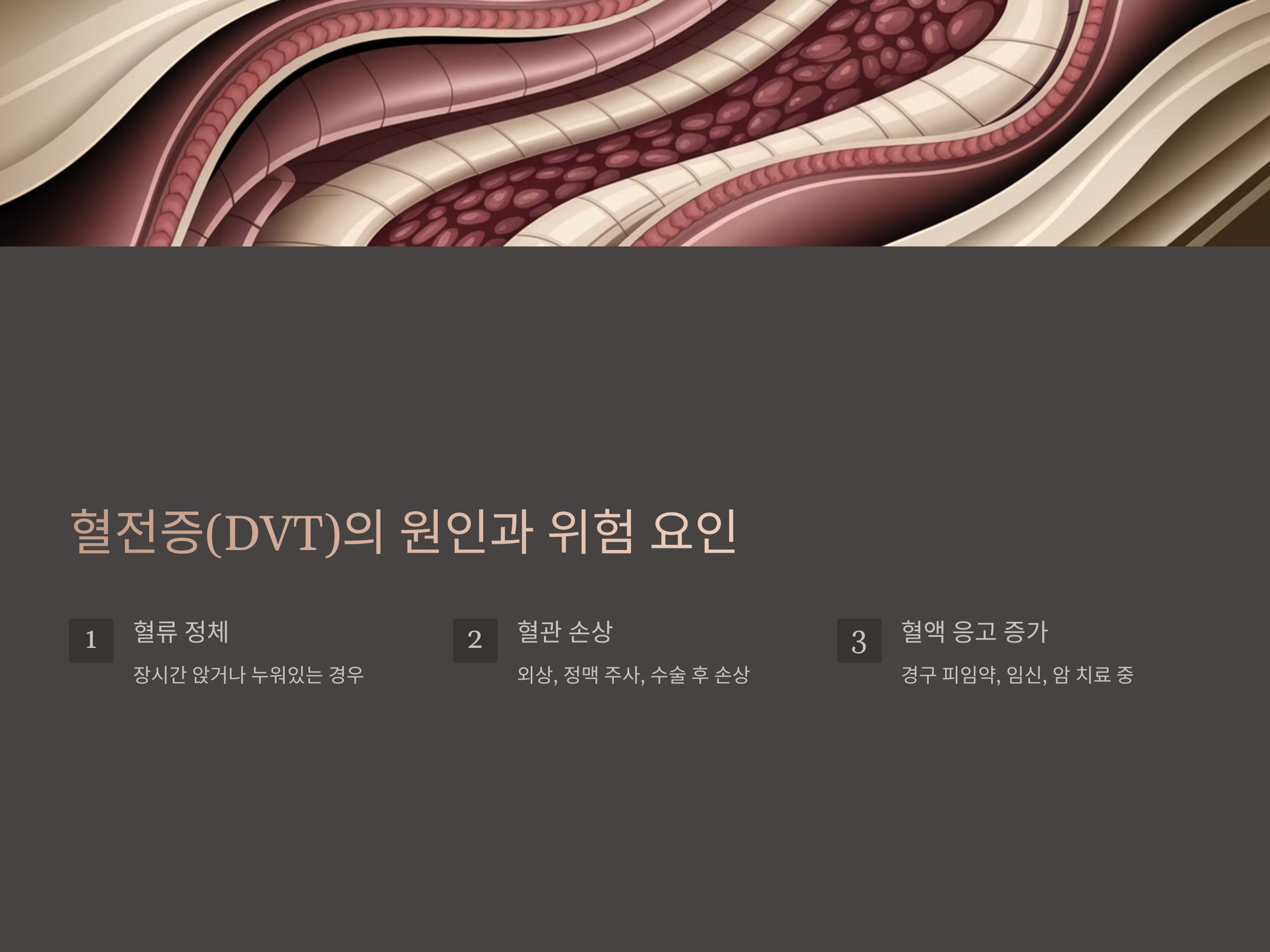심부정맥 혈전증은 혈류 정체, 혈관 손상, 과도한 혈액 응고라는 세 가지 주요 요인에 의해 발생합니다.