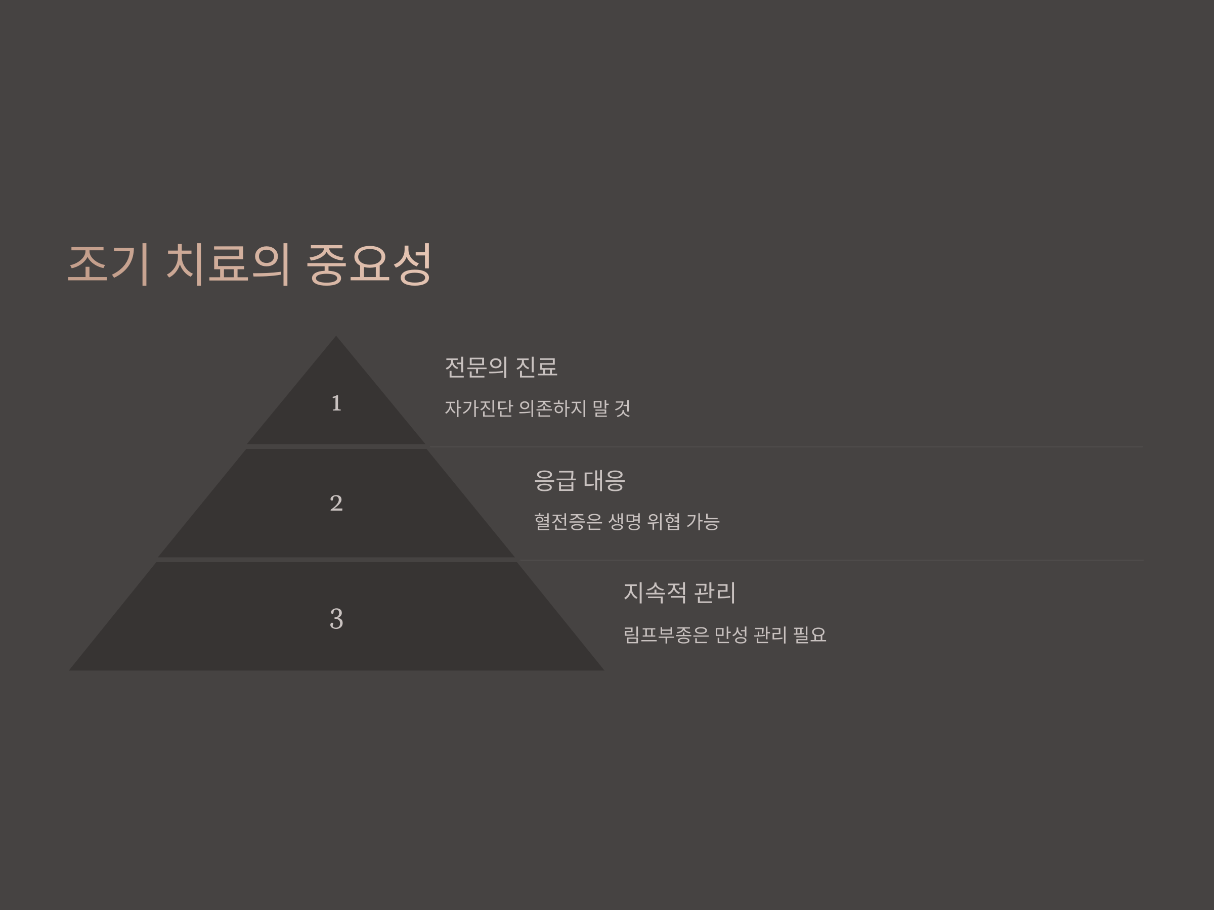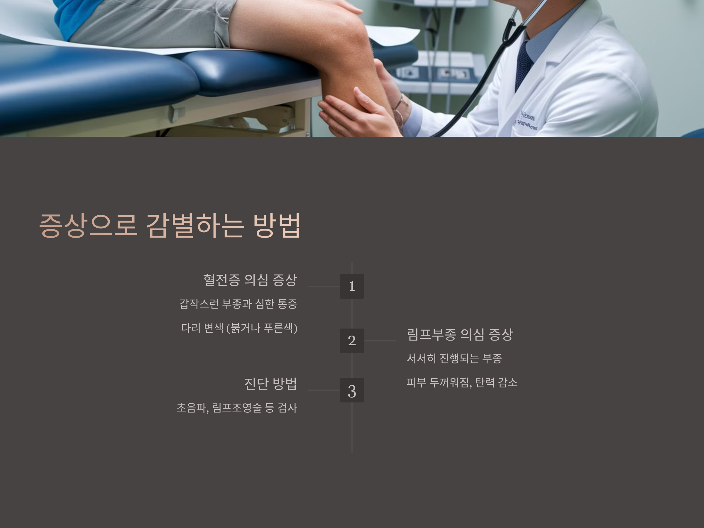 혈전증과 림프부종은 초기에는 유사한 증상을 보이지만, 진행 과정과 치료법이 전혀 다릅니다. 혈전증은 생명을 위협할 수 있으므로 응급 치료가 필수이며, 림프부종은 만성적인 관리가 필요합니다. 따라서 다리가 갑자기 붓거나 심한 통증이 있을 경우 자가 진단에 의존하지 말고 전문의의 진료를 받는 것이 가장 안전한 선택입니다.