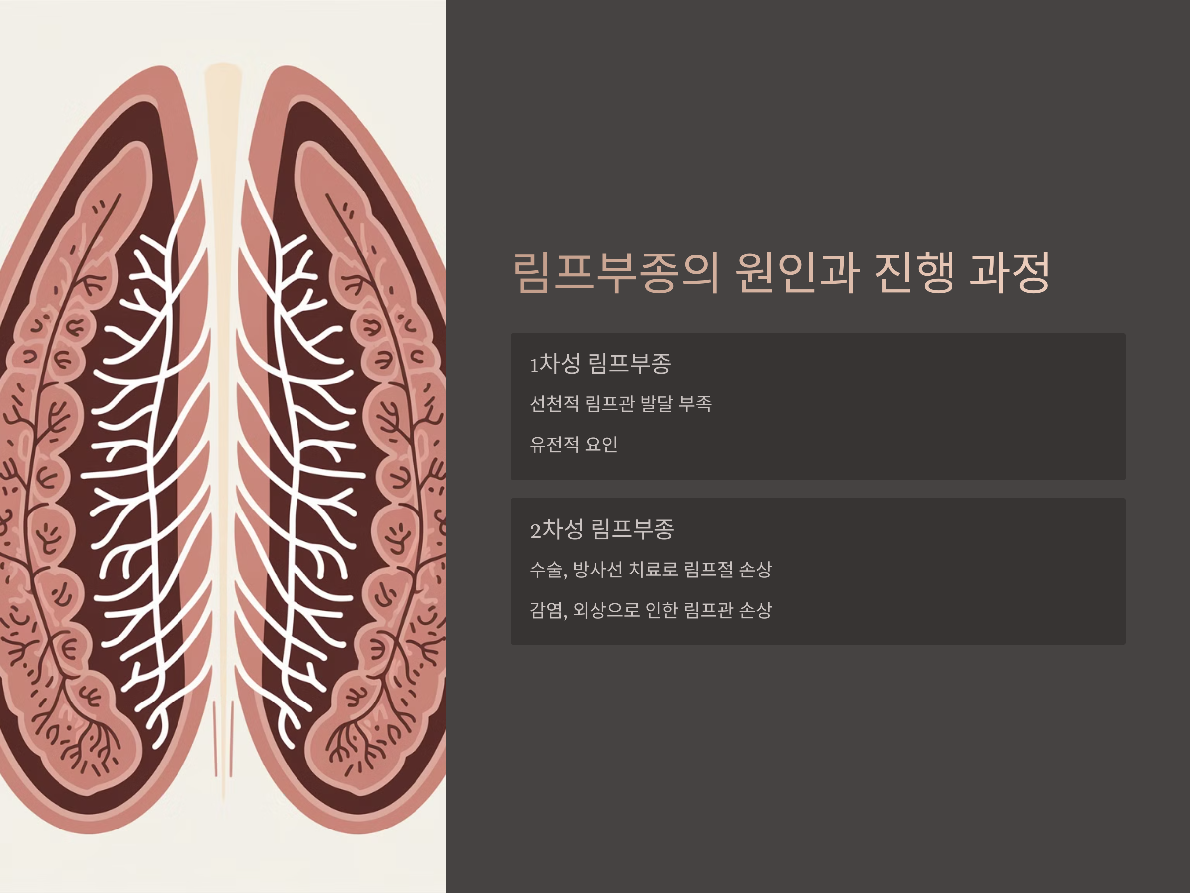 림프부종은 서서히 진행되며 초기에는 부드러운 부종이지만 시간이 지나면 조직이 단단해지고 만성적으로 진행될 수 있습니다.