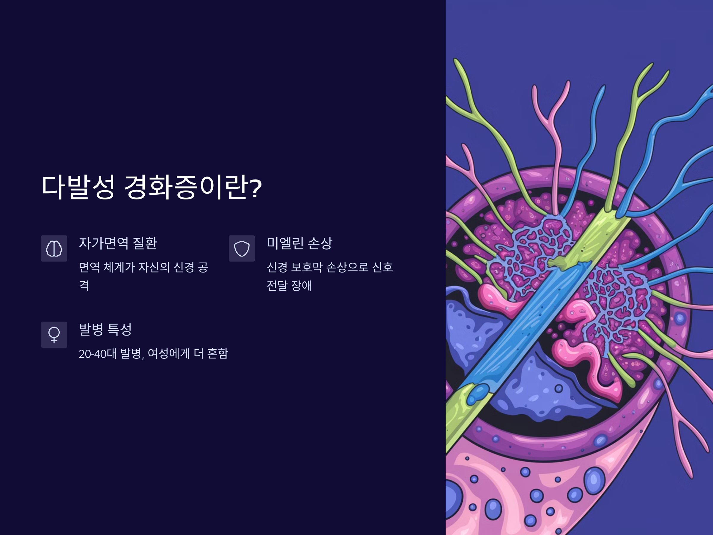 다발성 경화증은 면역 체계가 자신의 신경을 공격하는 자가면역 질환입니다. 이 질환은 뇌와 척수의 신경을 둘러싼 보호막인 '미엘린'을 손상시켜 신경 신호 전달에 장애를 일으킵니다. 미엘린이 손상되면, 신경 신호가 정상적으로 전달되지 않게 되어 여러 신경학적 증상이 나타날 수 있습니다. 다발성 경화증은 일반적으로 20대에서 40대 사이에 발병하며, 여성에서 남성보다 더 자주 발생합니다.