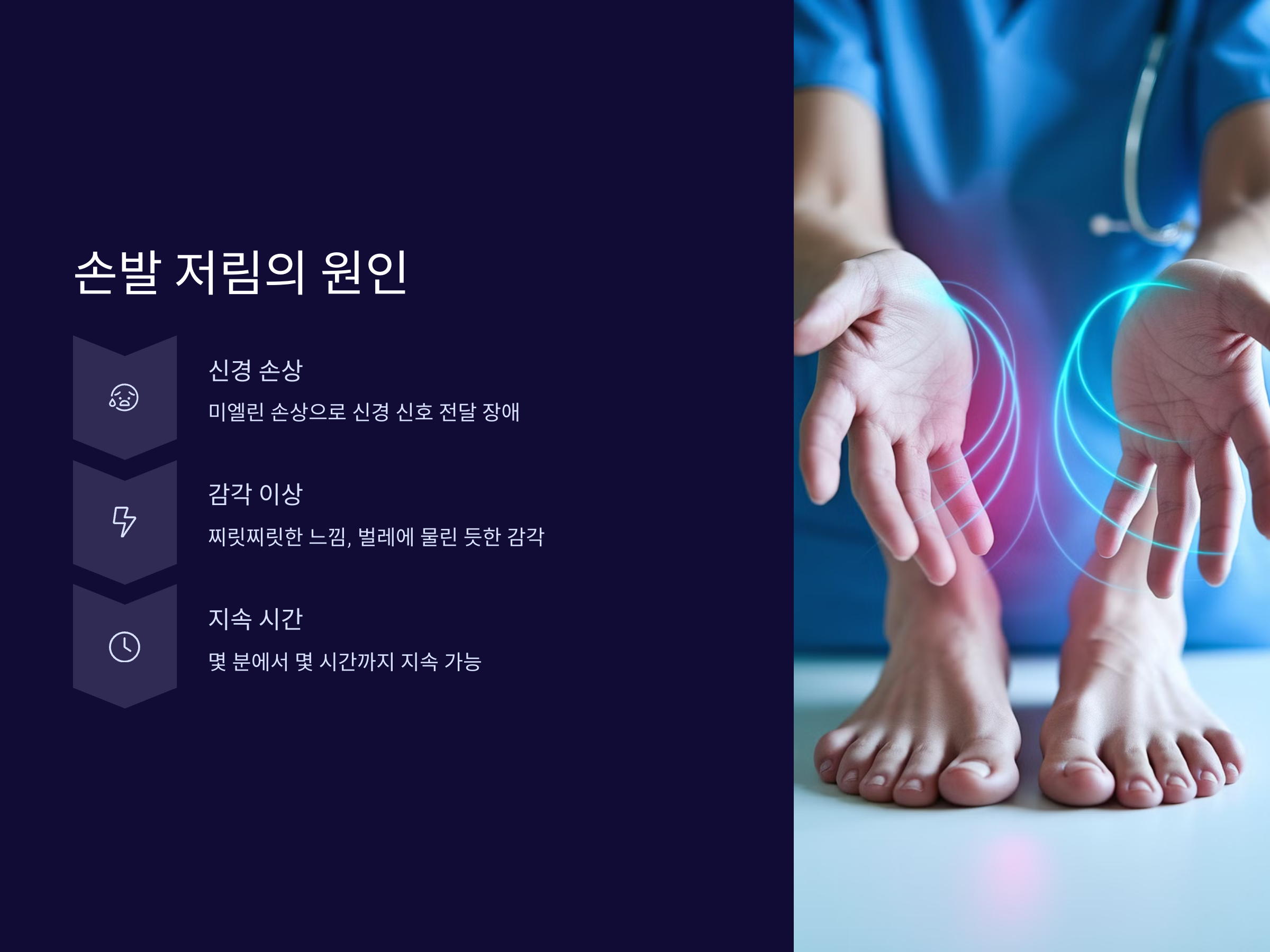 저림 증상은 미엘린이 손상된 부위에 따라 발생하는데, 이때 신경 신호 전달에 지장이 생기기 때문입니다. 신경이 적절히 신호를 전달하지 못하면, 손발에 마비, 저림, 따끔거림 등이 동반될 수 있습니다. 이 증상은 몇 분에서 몇 시간까지 지속되며, 때로는 지속적인 불편을 초래하기도 합니다.
