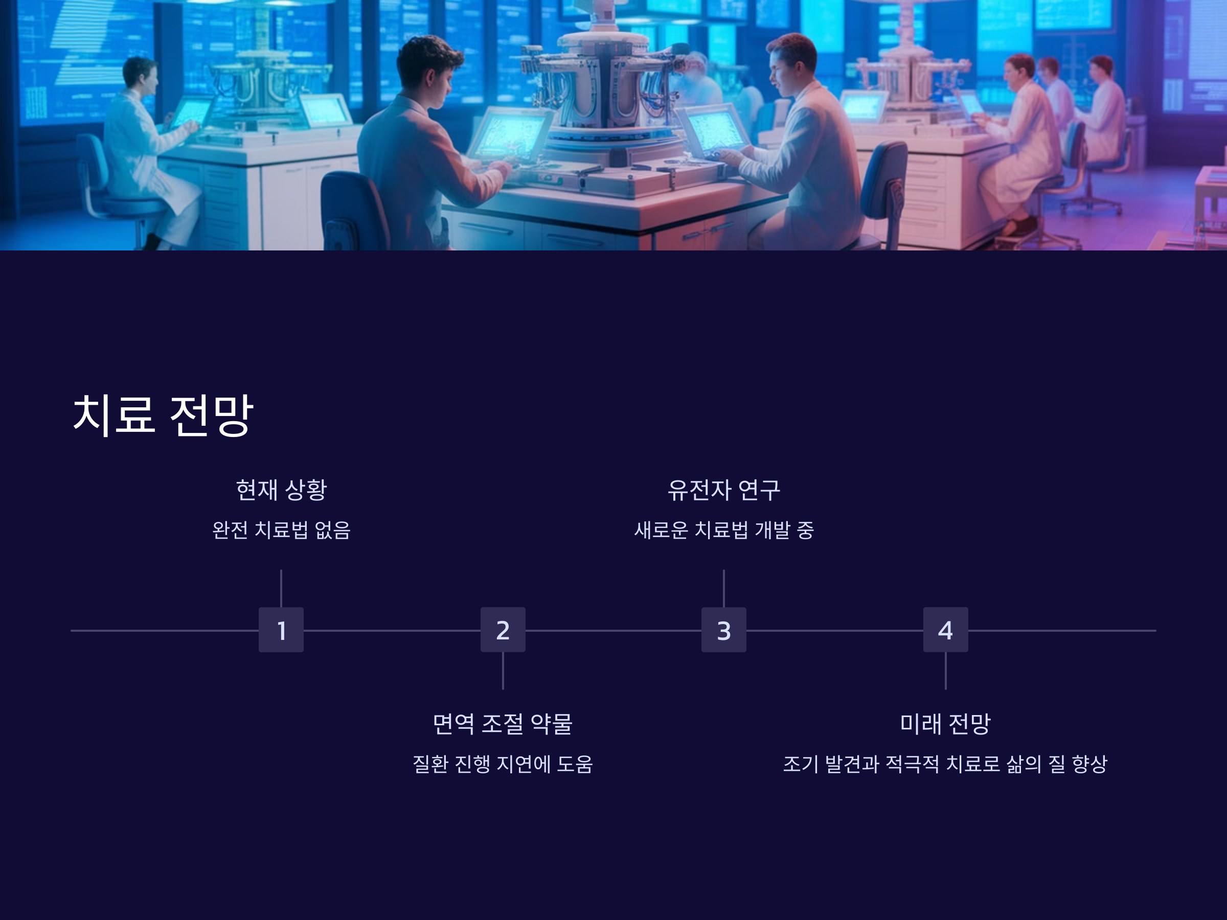 현재까지 다발성 경화증을 완전히 치료할 방법은 없지만, 다양한 치료법들이 연구되고 있습니다. 최근에는 면역 체계의 반응을 조절하는 약물들이 개발되었고, 이는 질환의 진행을 늦추는 데 도움이 될 수 있습니다. 또한, 유전자 연구와 함께 보다 효과적인 치료 방법이 등장할 것으로 예상됩니다.