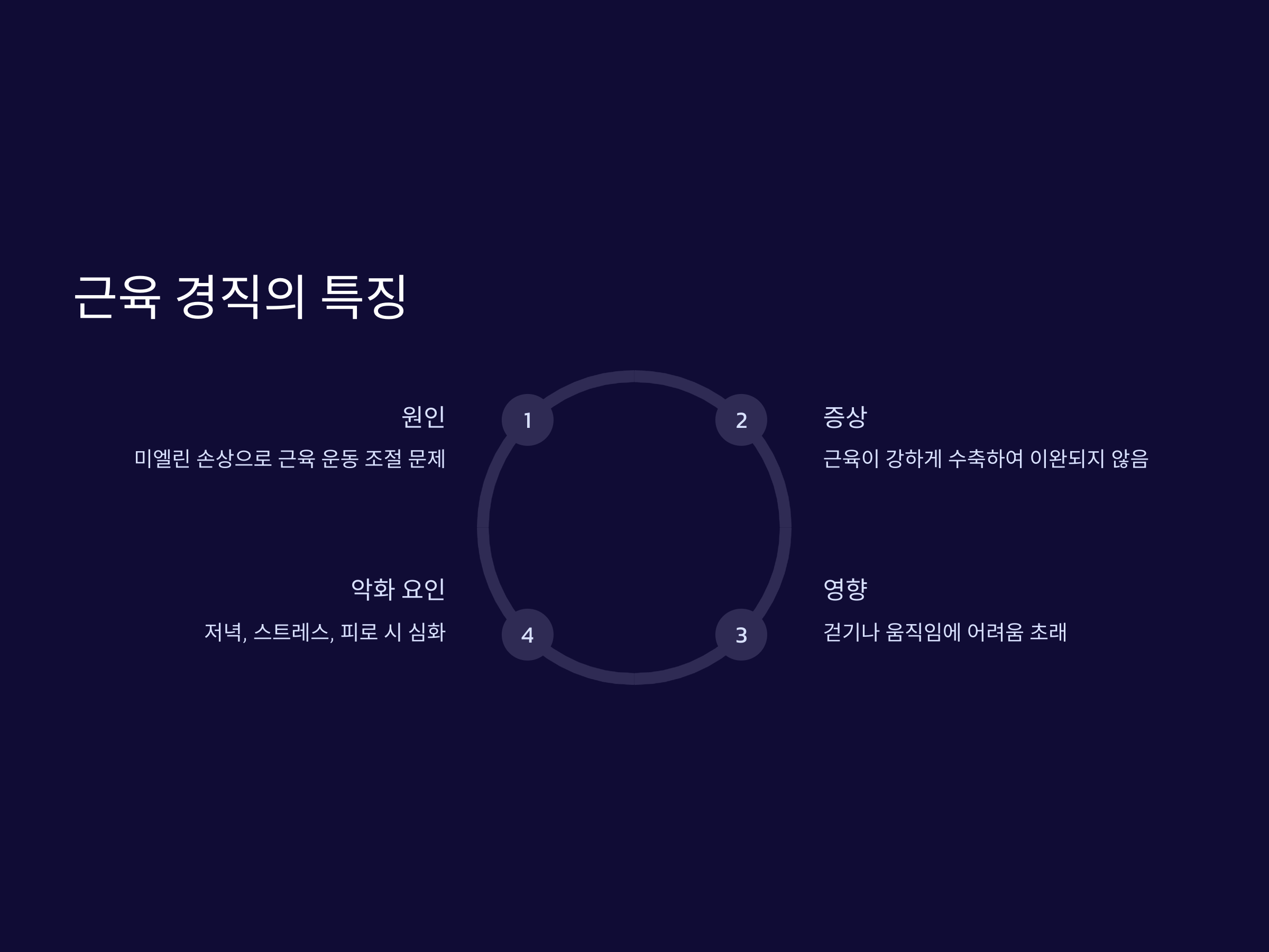 근육 경직은 MS의 병리학적 특성인 미엘린의 손상과 관련이 있습니다. 미엘린이 손상되면 신경이 정상적으로 작동하지 않아 근육의 운동 조절에 문제가 생깁니다. 이는 근육이 지속적으로 긴장 상태에 놓이게 되어, 결과적으로 경직 증상이 나타나게 됩니다. 경직은 종종 저녁에 더 심해지며, 스트레스나 피로가 가중될 수 있습니다.