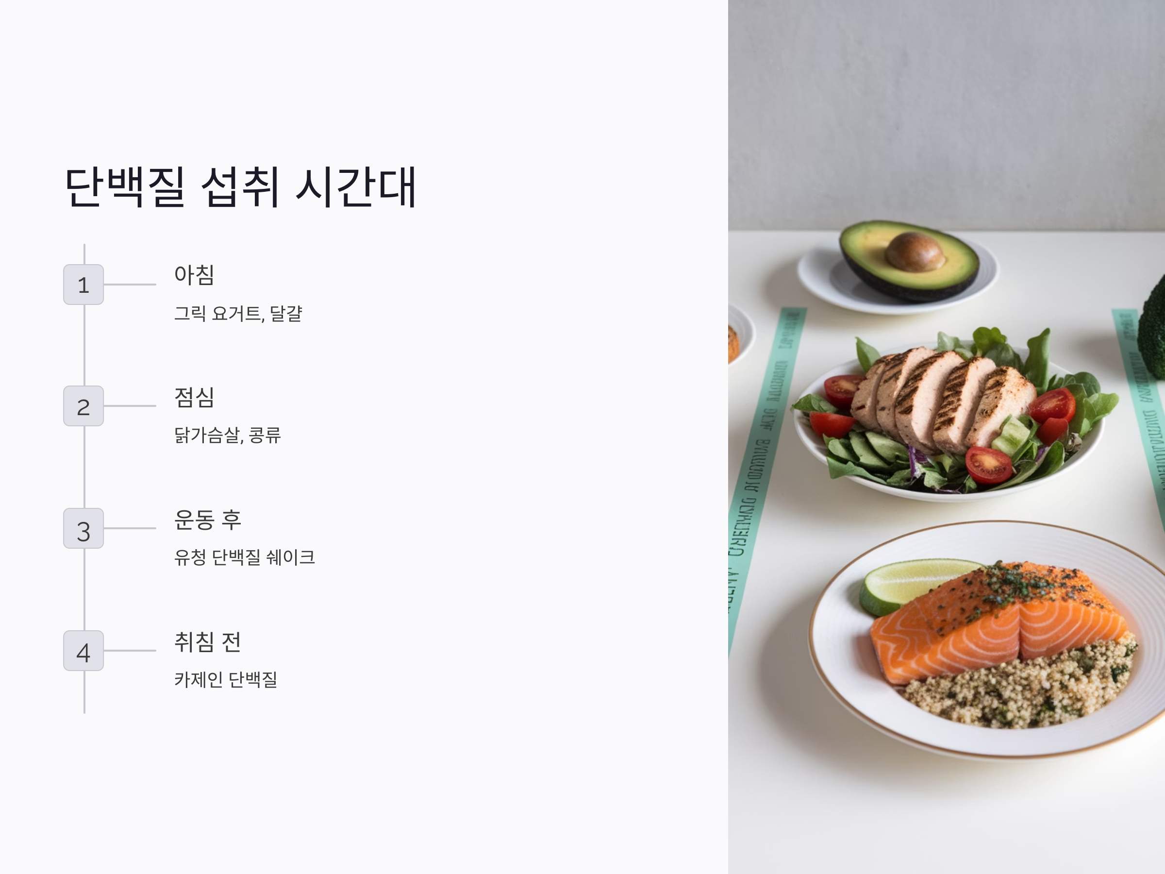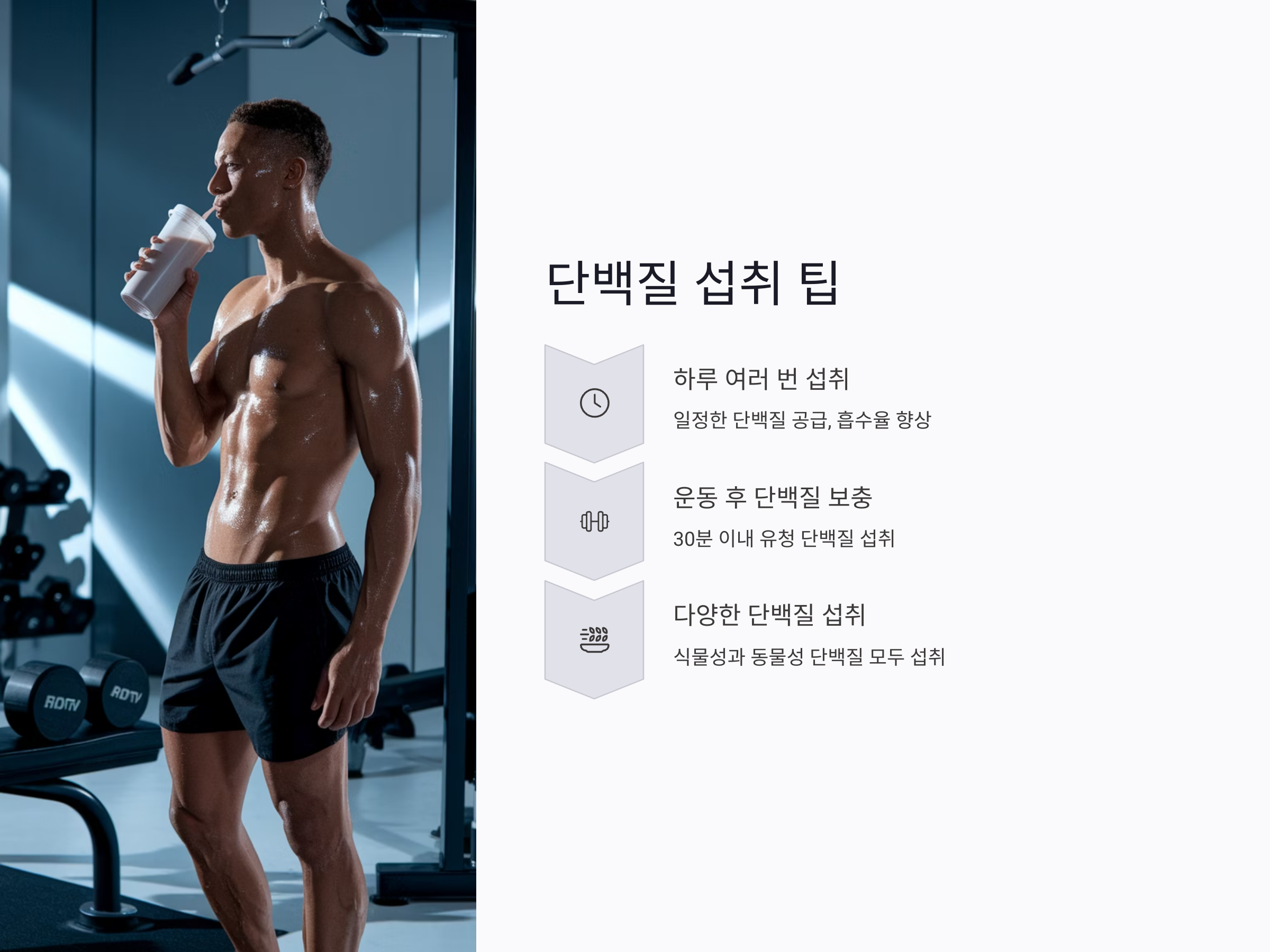 단백질을 한 번에 많은 양을 섭취하는 것보다는 하루 동안 여러 번 나누어 섭취하는 것이 좋습니다. 이는 근육에 일정한 단백질을 공급할 수 있게 도와주며, 흡수율을 높이는 데 효과적입니다.