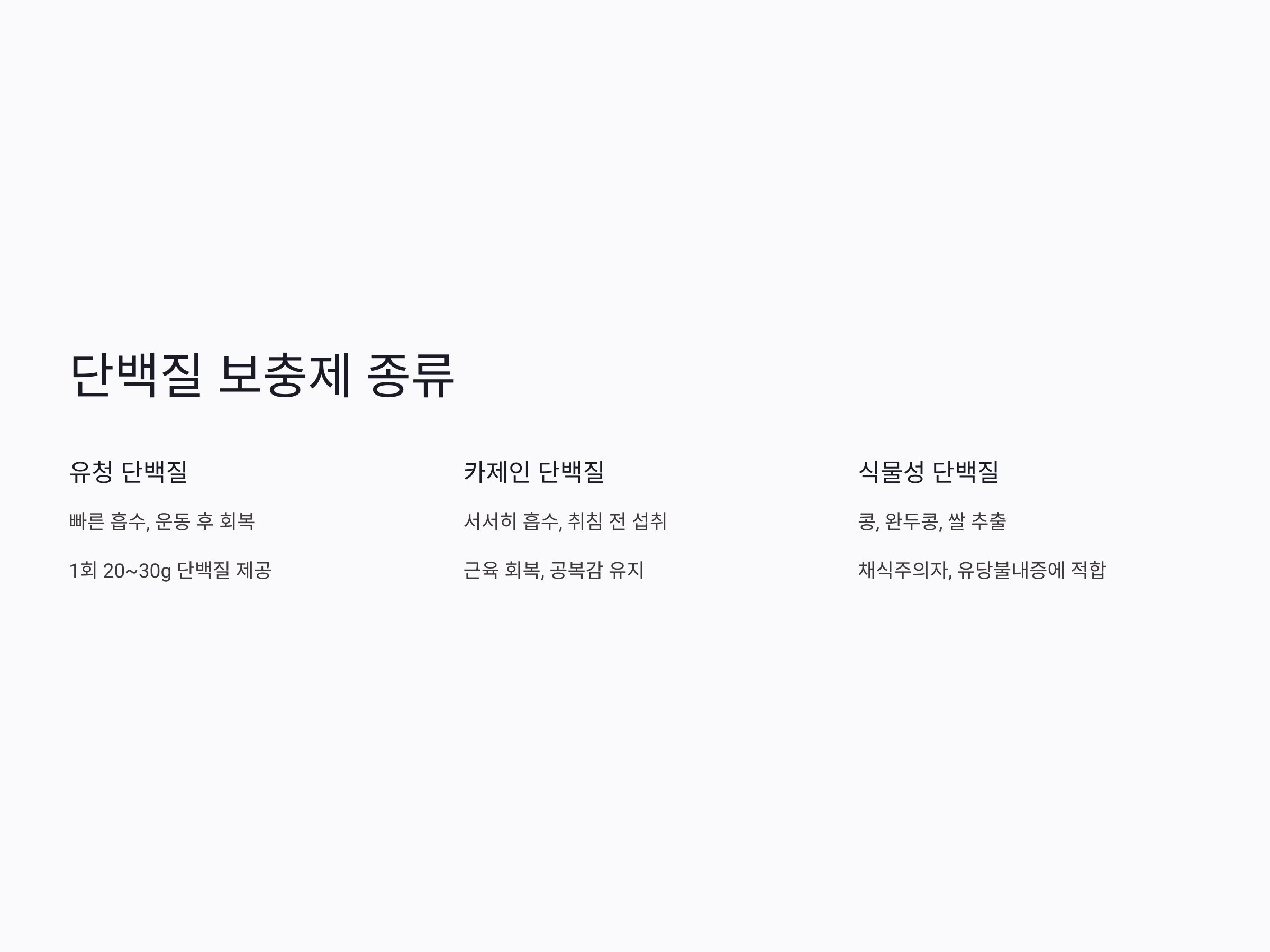 유청 단백질은 가장 많이 사용되는 단백질 보충제입니다. 빠르게 흡수되며, 운동 후 빠른 회복을 돕기 때문에 운동을 하는 사람들에게 특히 인기가 많습니다. 1회 섭취량에 약 20~30g의 단백질을 제공하며, 맛도 다양해서 꾸준히 섭취하기 좋습니다.