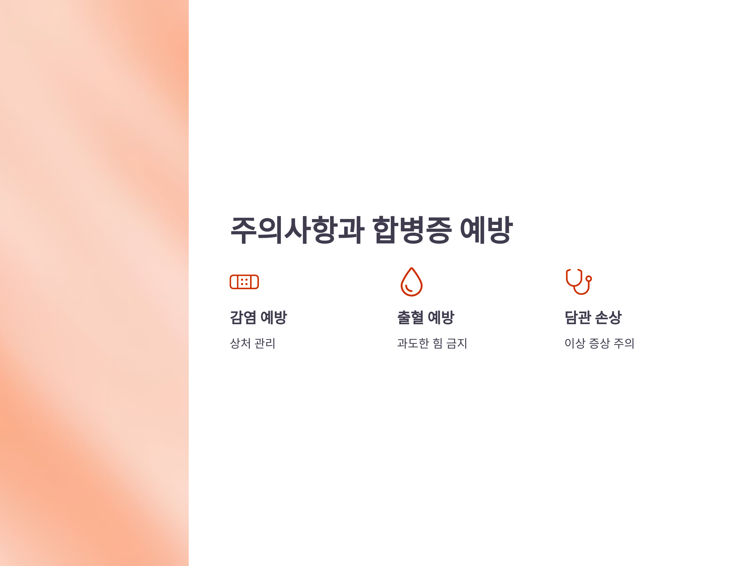 담낭절제술 후 합병증을 예방하려면 수술 후 주의사항을 잘 따르는 것이 중요합니다. 가장 흔한 합병증은 감염, 출혈, 담관 손상 등이 있으며, 이를 방지하기 위해서는 퇴원 후 몇 가지 주의사항을 지키는 것이 중요합니다.