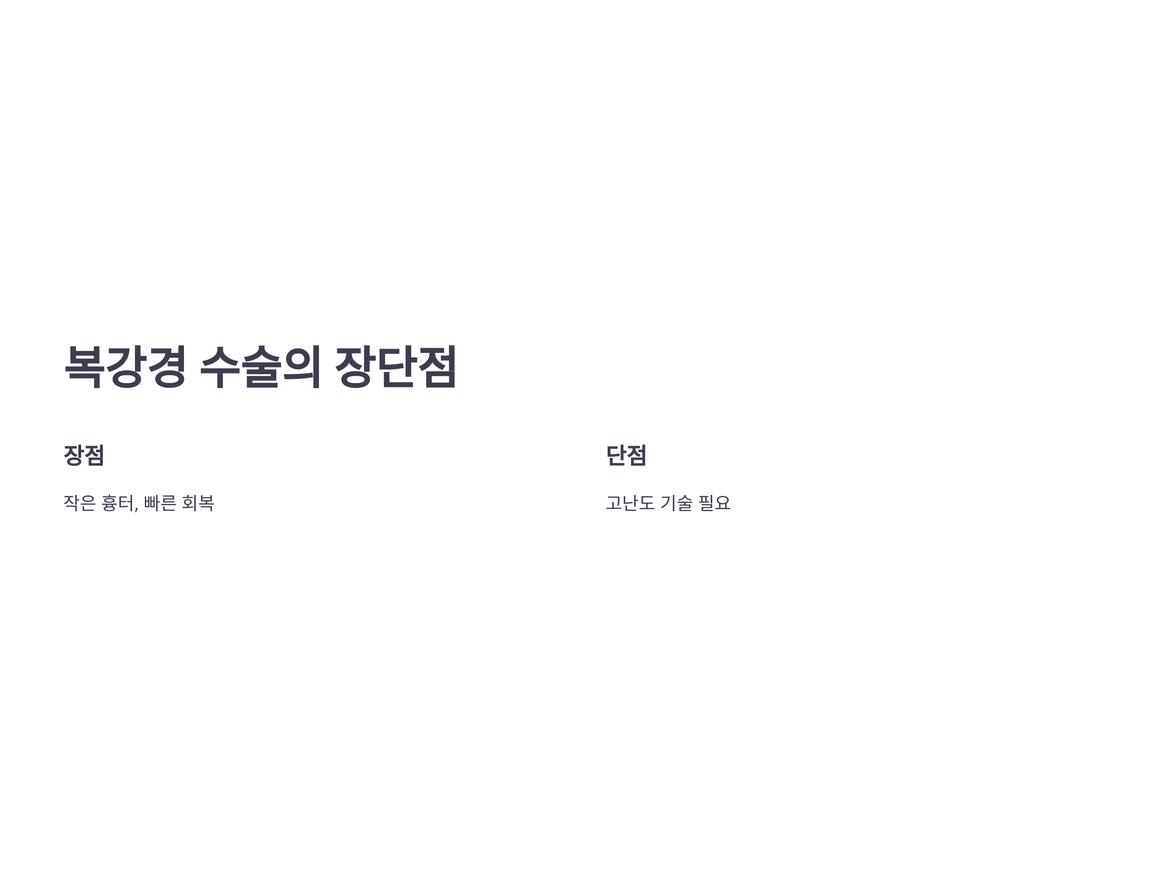 복강경 수술은 전통적인 개복 수술에 비해 많은 장점이 있습니다. 하지만 몇 가지 단점도 존재하므로, 이를 충분히 이해한 후 수술을 결정하는 것이 중요합니다.