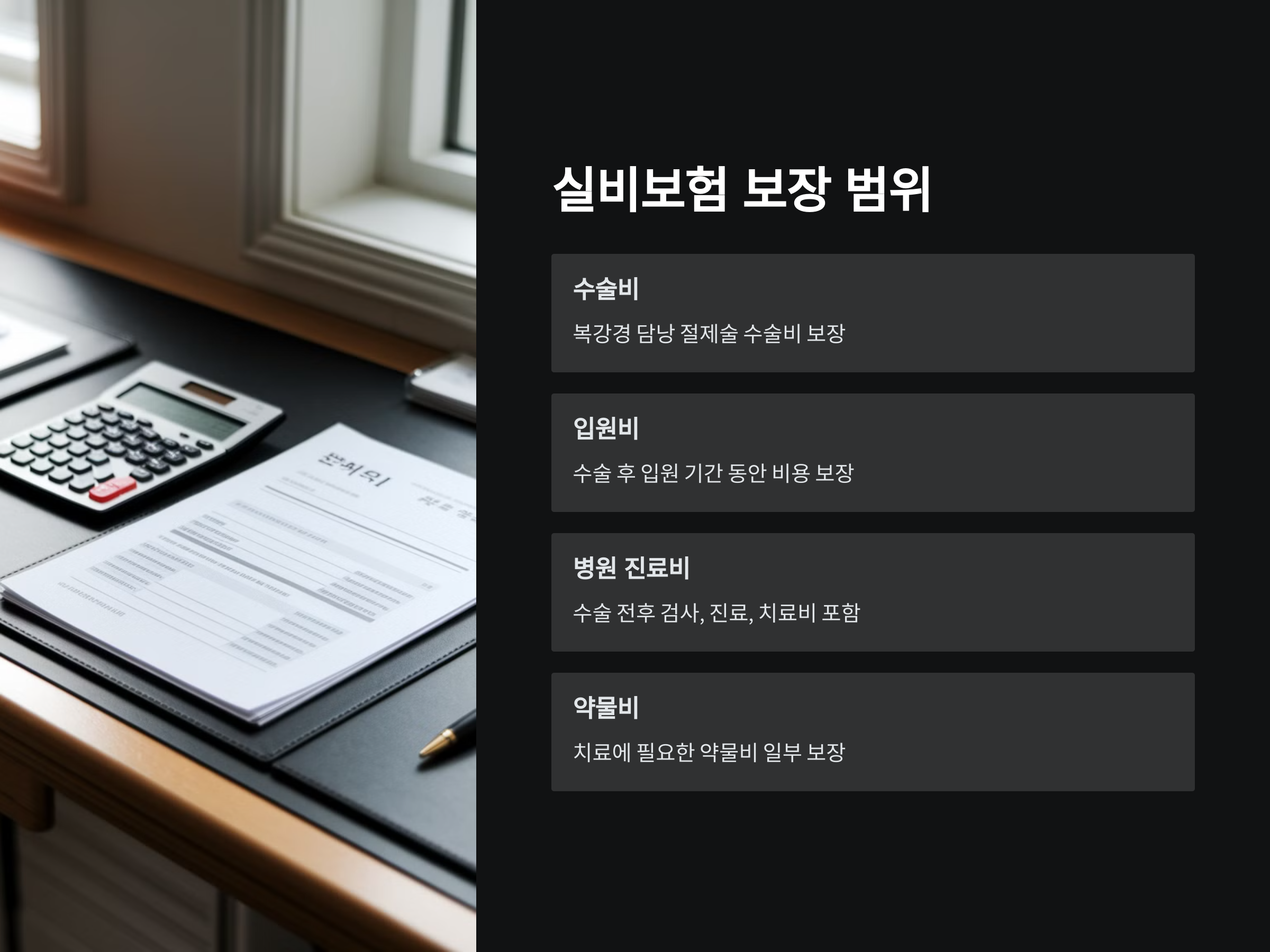 - 병원 진료비: 수술 전후의 검사, 진료 및 치료비도 실비보험 적용 항목에 포함될 수 있습니다.