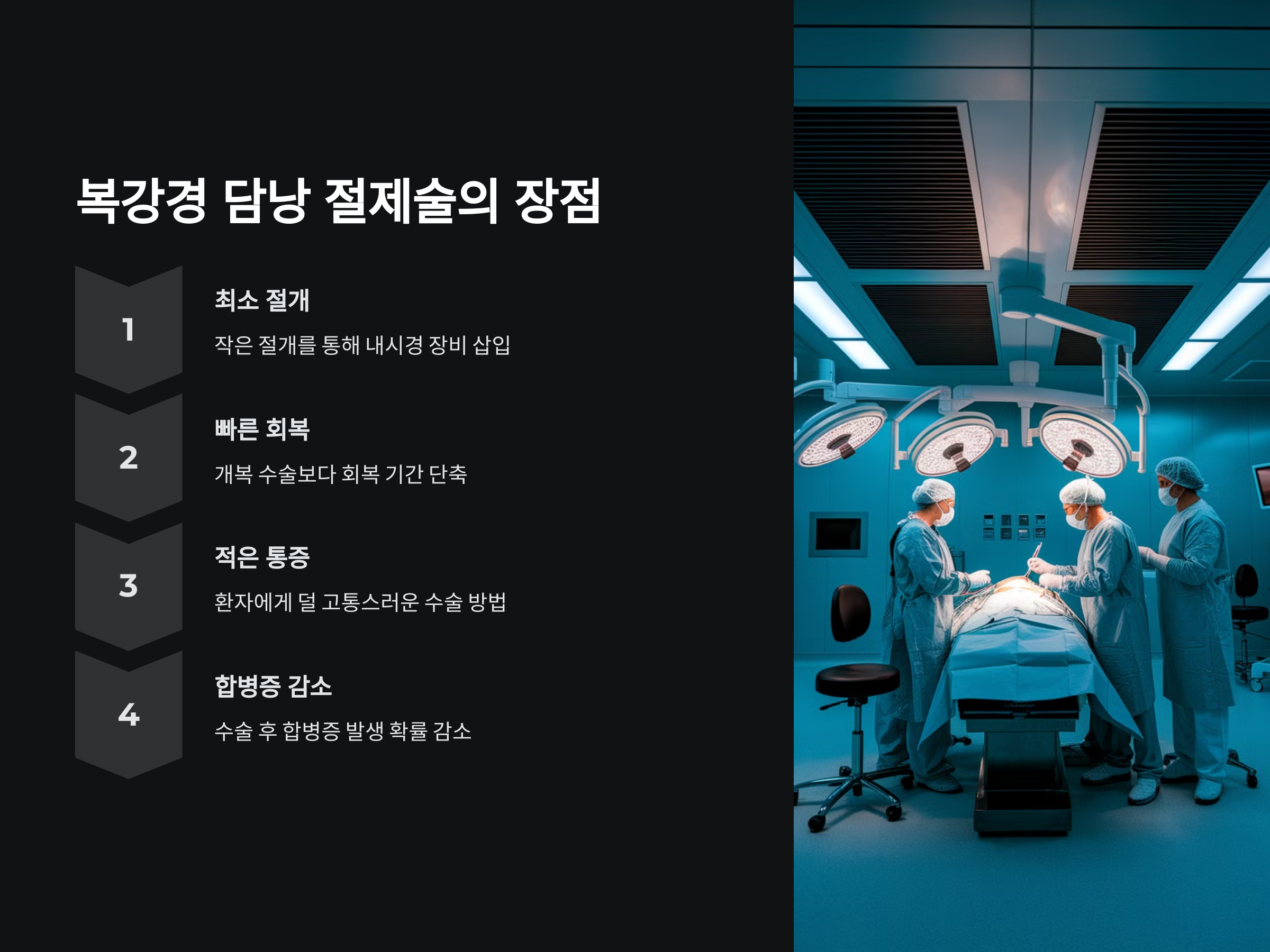 복강경 담낭 절제술은 전통적인 개복 수술에 비해 회복이 빠르고, 수술 후 합병증 발생 확률이 적은 장점이 있습니다. 이 수술은 작은 절개를 통해 내시경 장비를 삽입하여 진행되므로, 환자에게 덜 고통스럽고 빠른 회복을 기대할 수 있습니다.