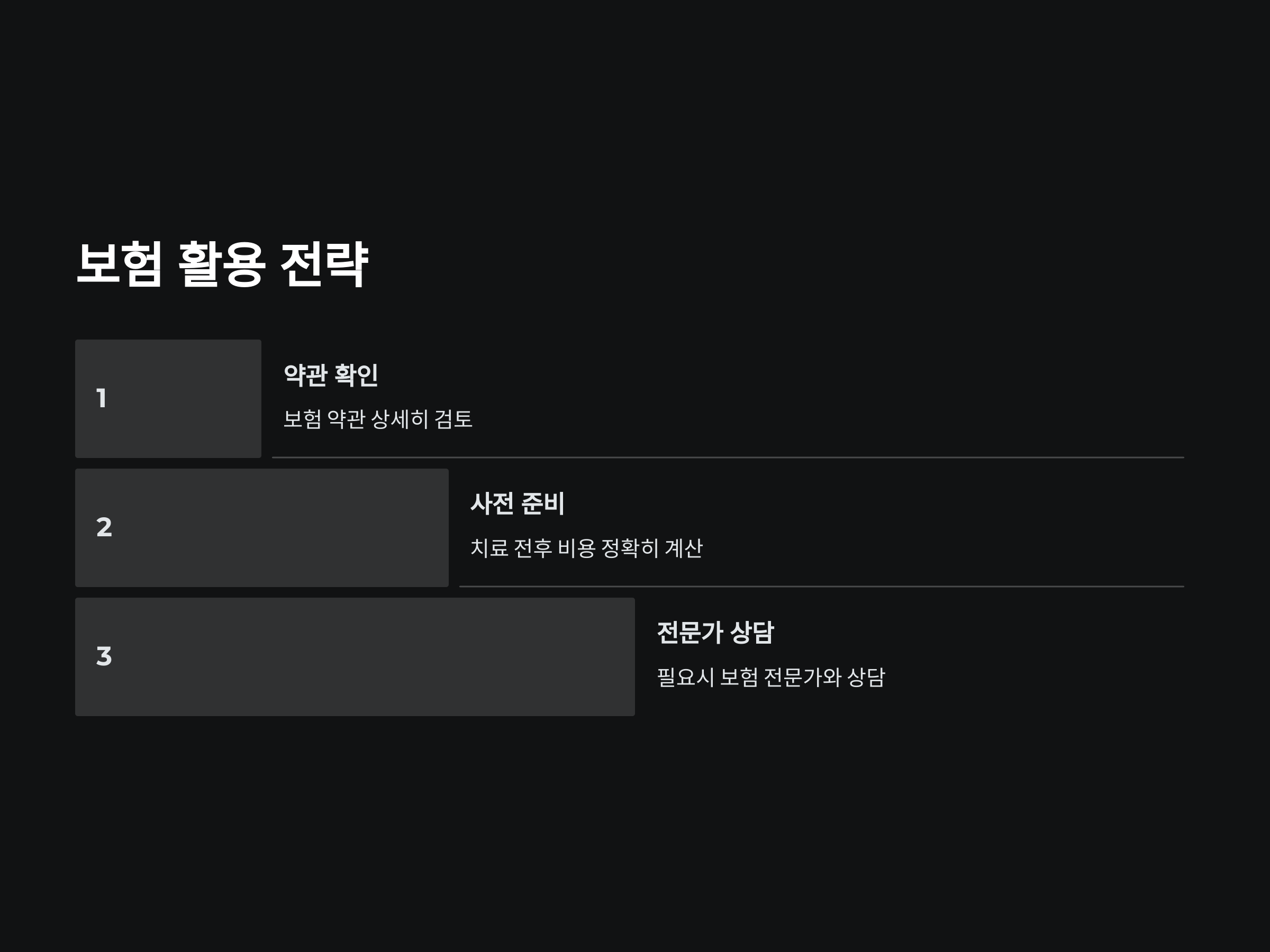 - 보험금 청구 절차: 치료비가 발생한 후에는 보험금을 청구해야 하며, 청구 시 필요한 서류를 정확히 준비해야 합니다.