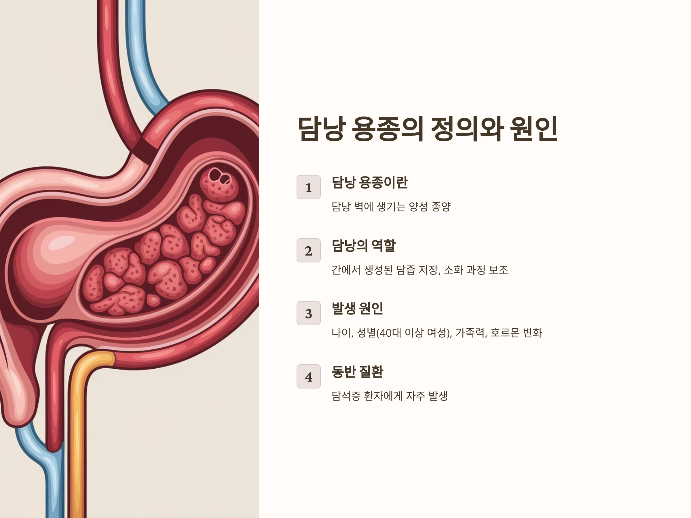 이 포스팅에서는 담낭 용종과 관련된 주요 증상, 발생 원인, 그리고 통증이나 소화 불량을 완화하는 방법에 대해 상세히 설명하겠습니다. 또한, 이러한 증상이 나타날 때 필요한 검사 및 치료 방법을 다루며, 용종과 관련된 다양한 오해를 풀어보겠습니다.