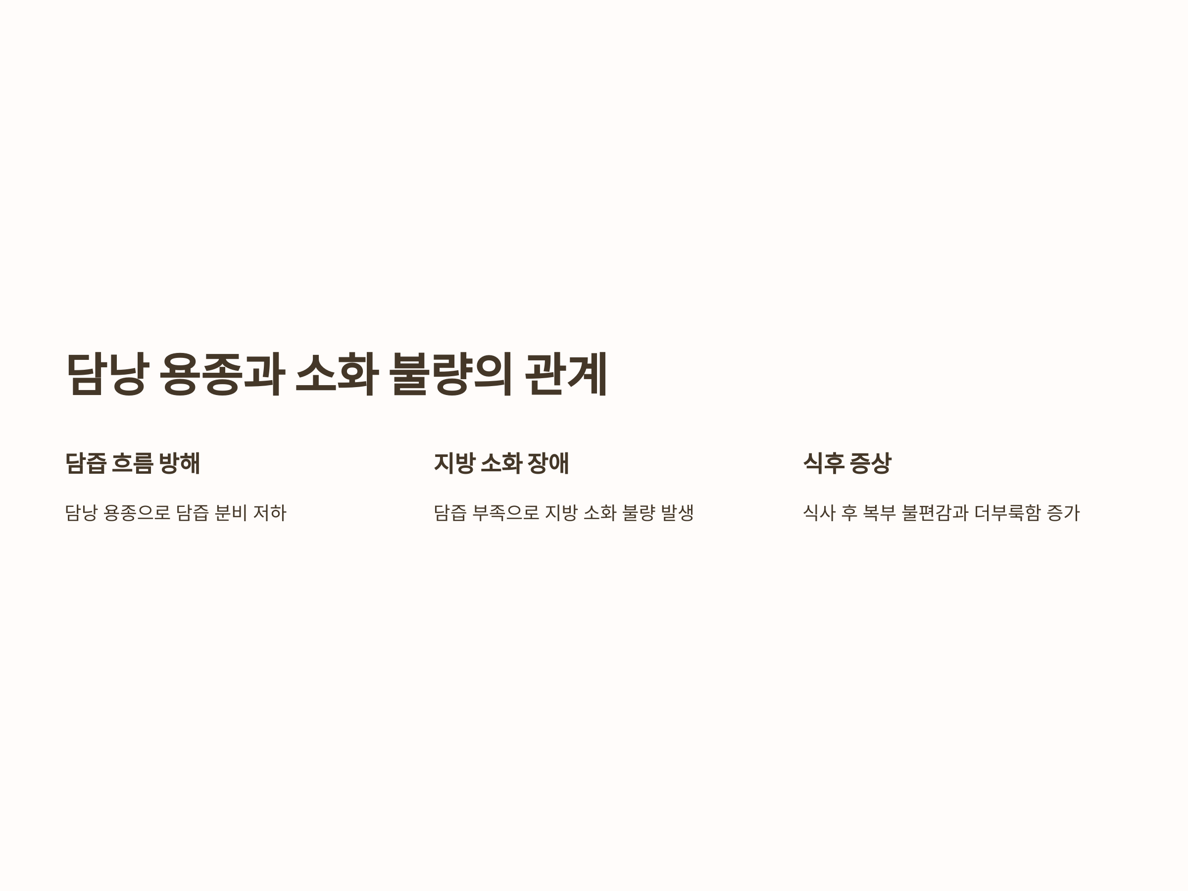 소화 불량은 보통 복부 불편감, 더부룩함, 가슴 답답함 등의 증상으로 나타납니다. 담낭 용종이 이러한 증상을 유발하는 경우, 치료를 통해 용종을 제거하거나 관리하는 것이 중요합니다. 담낭 용종이 크고, 담즙의 흐름을 방해하는 경우에는 수술적 치료가 필요할 수도 있습니다.