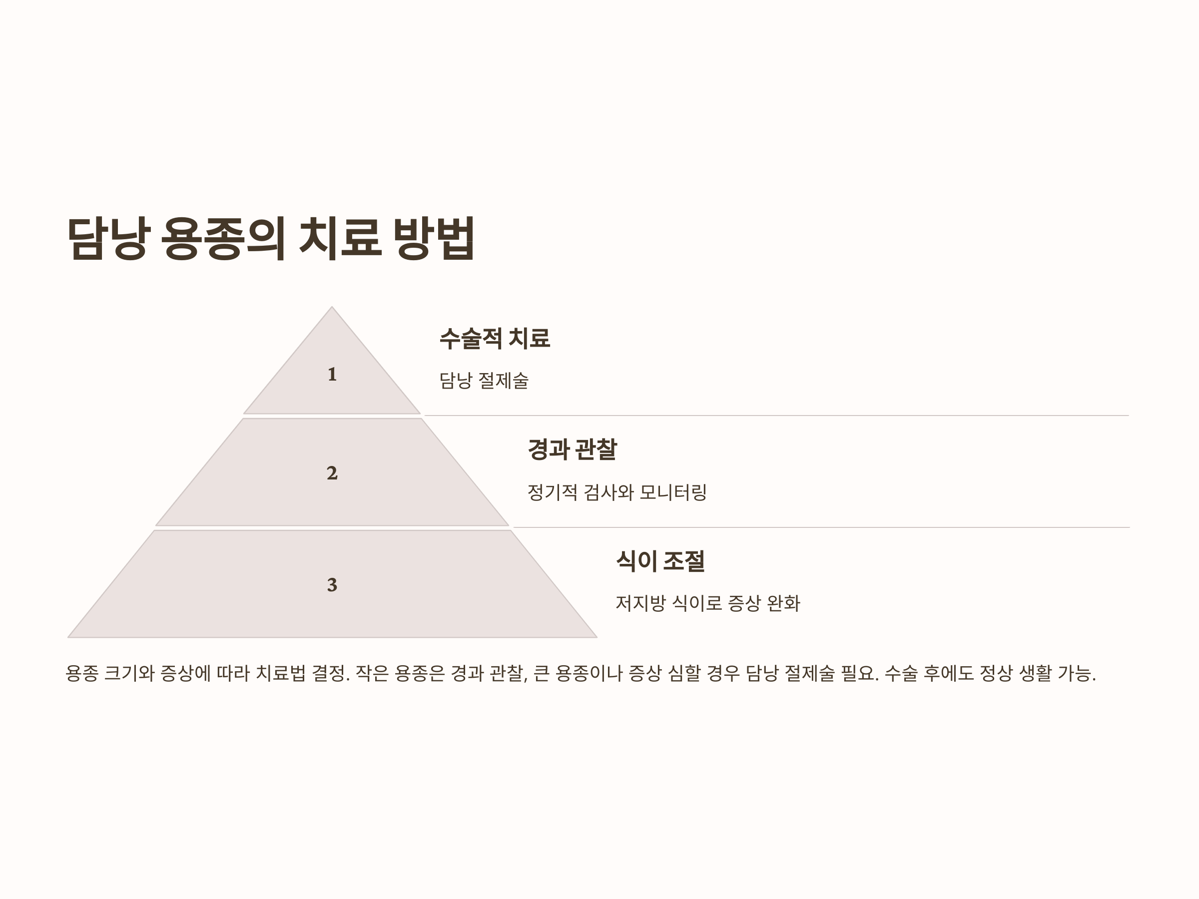 용종이 담즙의 흐름에 영향을 미치는 경우에는 수술적 치료가 필요할 수 있습니다. 담낭 절제술은 용종이 크게 자라거나 통증을 유발할 때 시행되는 방법으로, 담낭을 전부 제거하는 수술입니다. 수술 후에는 담낭이 없더라도 소화 기능에 큰 지장이 없으며, 대부분의 환자가 정상적인 생활을 할 수 있습니다.