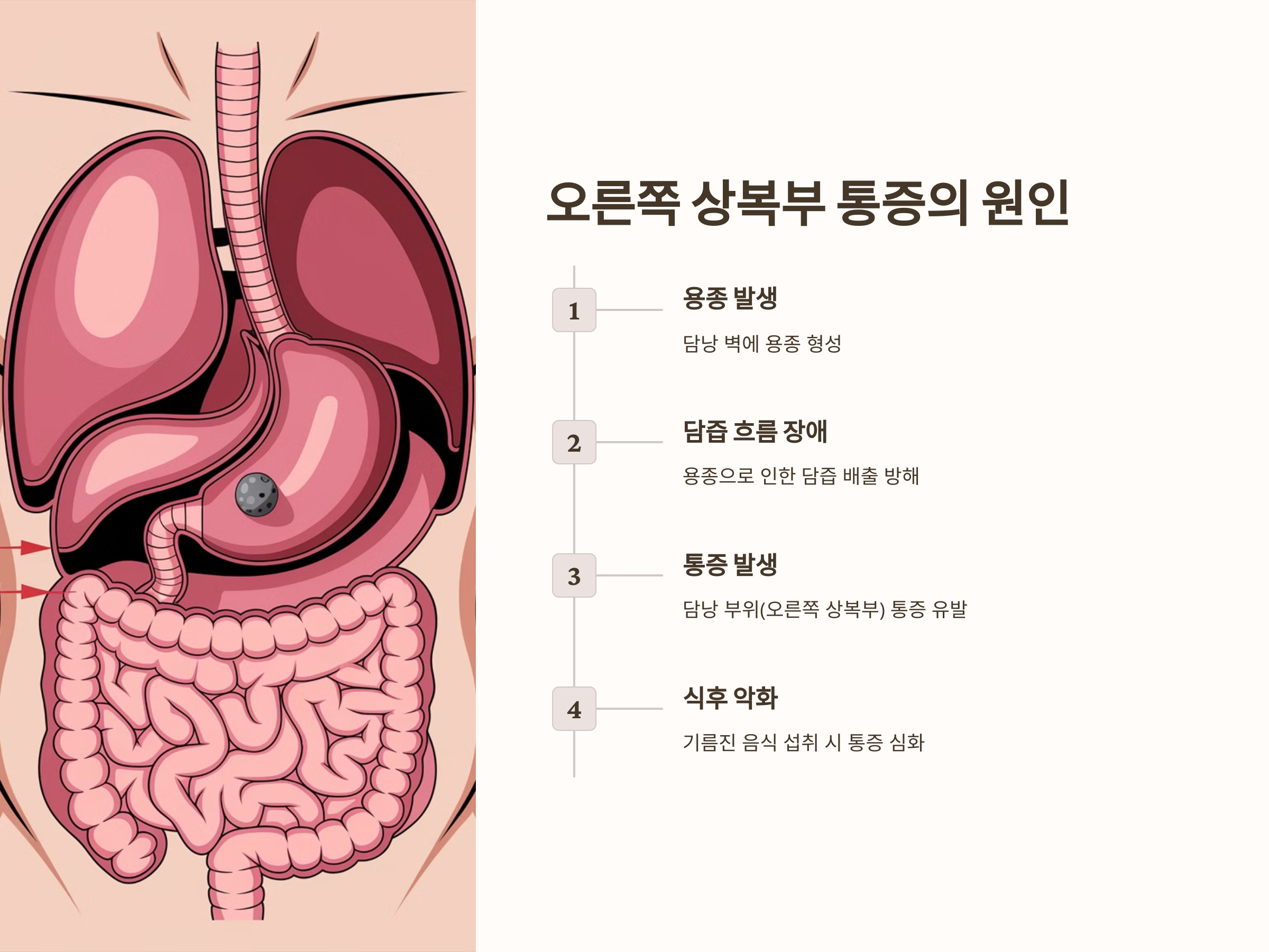 오른쪽 상복부 통증은 담낭 용종과 밀접하게 관련이 있을 수 있습니다. 담낭은 오른쪽 상복부에 위치하고 있기 때문에, 용종이 담낭에 발생하면 그 부위에서 통증을 유발할 수 있습니다. 담낭 용종으로 인한 통증은 대개 식사 후 더 심해지며, 특히 기름진 음식을 먹었을 때 강한 통증을 느낄 수 있습니다.
