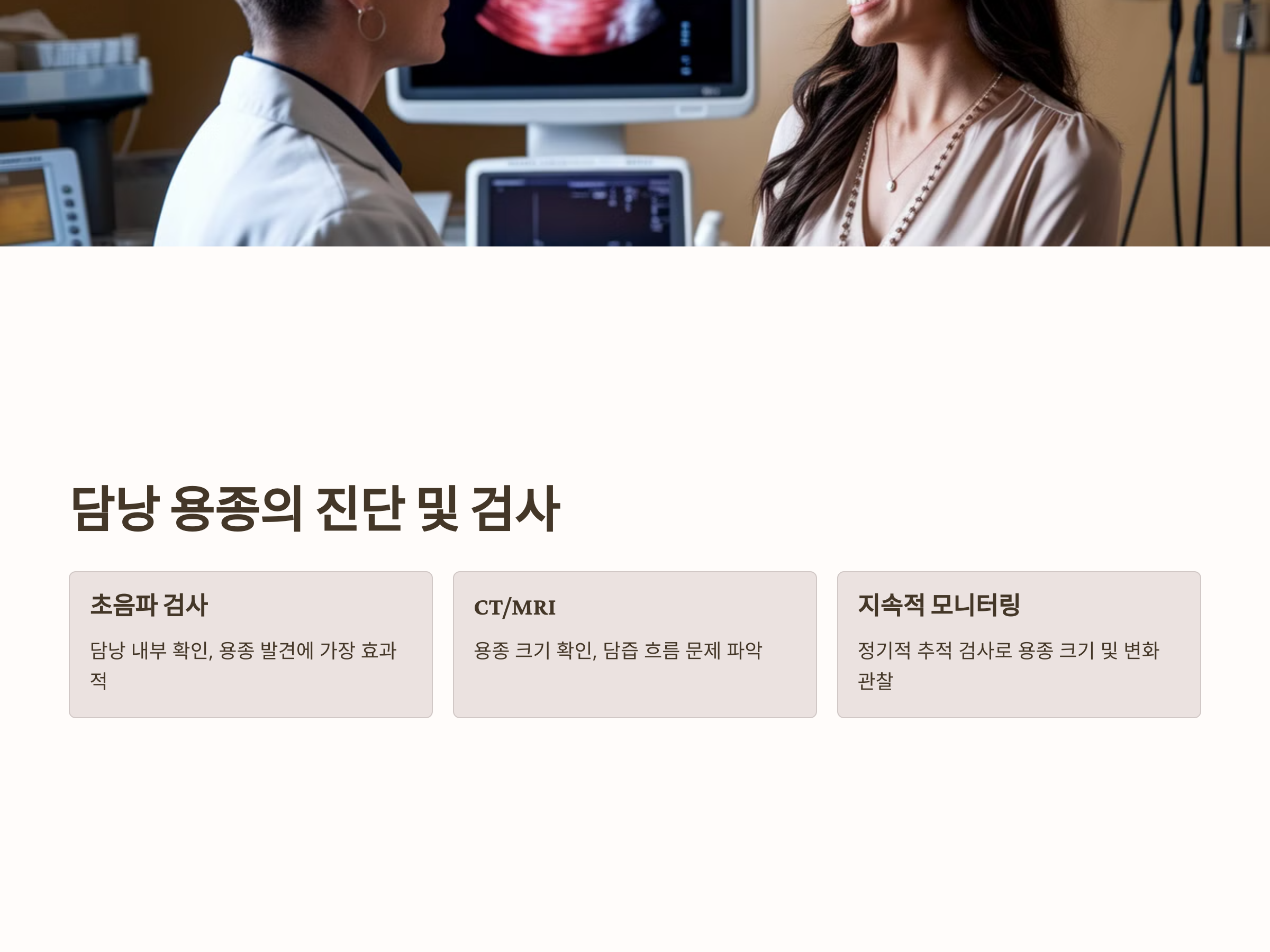 담낭 용종을 진단하기 위해서는 여러 가지 검사가 필요합니다. 가장 일반적인 검사는 초음파 검사로, 이는 담낭 내부를 확인하는 데 매우 효과적입니다. 초음파 검사에서 담낭 내의 용종이 발견되면, 크기와 위치를 확인하고 추가적인 검사나 치료 계획을 세울 수 있습니다. 만약 용종의 크기가 커지거나 담즙 흐름에 문제가 있는 경우, CT나 MRI 촬영이 필요할 수 있습니다.