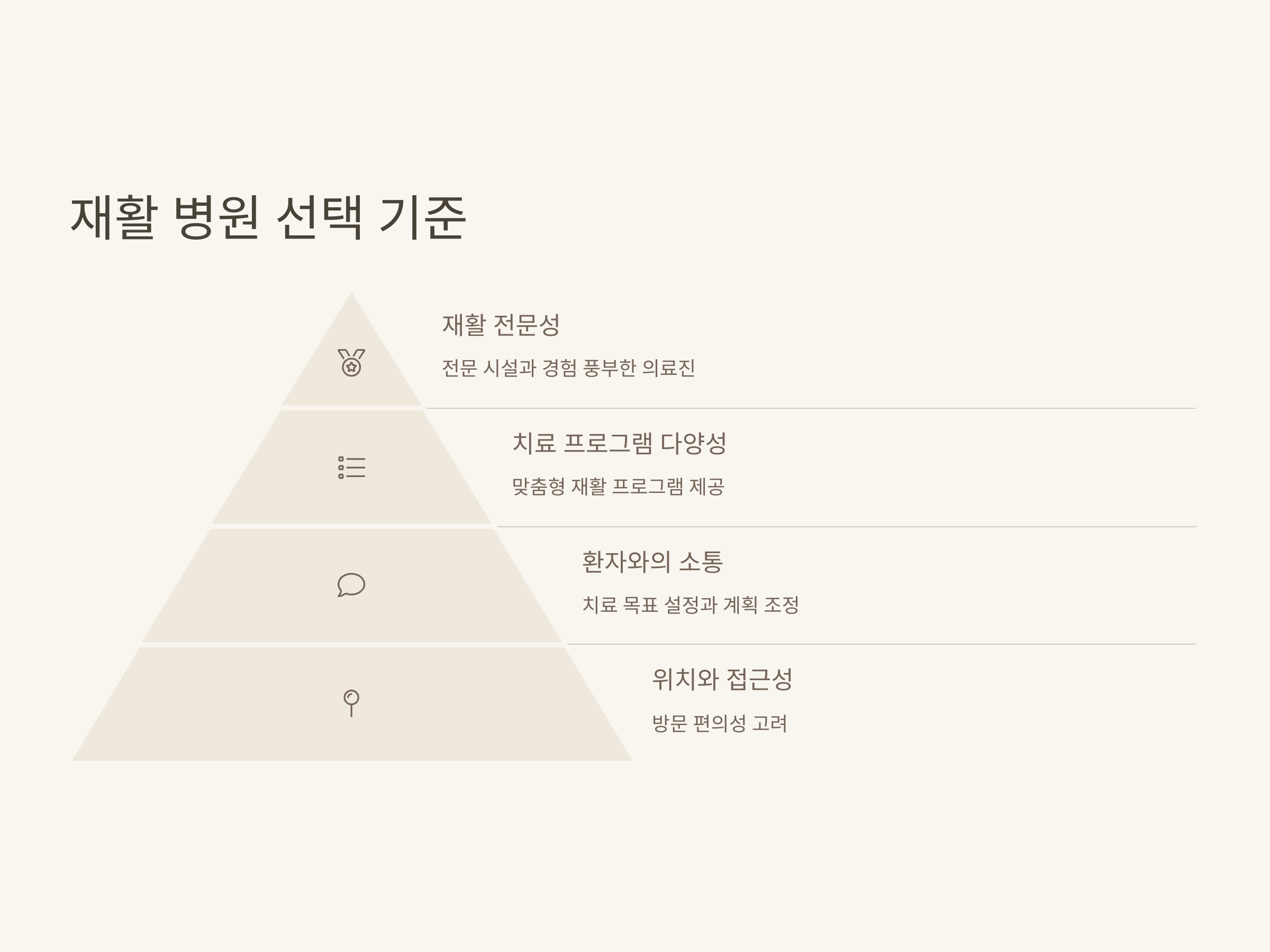 재활 병원의 첫 번째 기준은 해당 병원이 재활 치료에 특화되어 있는지 여부입니다. 재활을 위한 전문적인 시설과 인프라, 그리고 경험이 풍부한 재활 전문의와 치료사가 있어야 합니다. 재활 병원의 시설이 고도화되고 체계적이면 회복 기간을 단축하고, 더 좋은 결과를 얻을 수 있습니다.