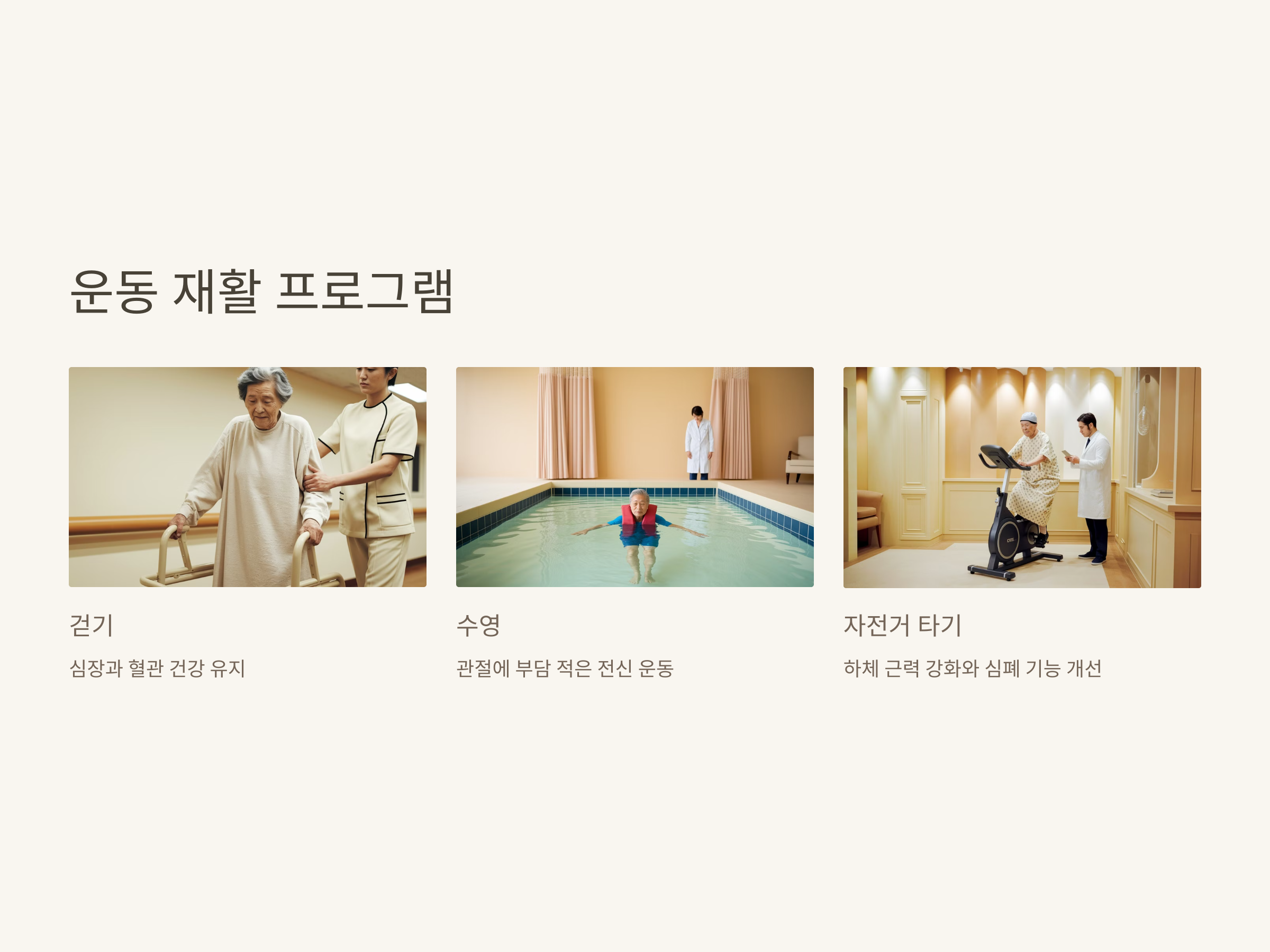 대동맥류 치료 후에는 다양한 종류의 재활 프로그램이 필요합니다. 운동치료, 물리치료, 심리 상담, 그리고 직업 재활 등 환자의 상태에 맞춘 다양한 프로그램을 제공하는 병원을 선택하는 것이 좋습니다. 이러한 치료 프로그램은 환자 개개인의 회복 상황에 맞추어 세분화된 맞춤형 치료를 받을 수 있게 해줍니다.