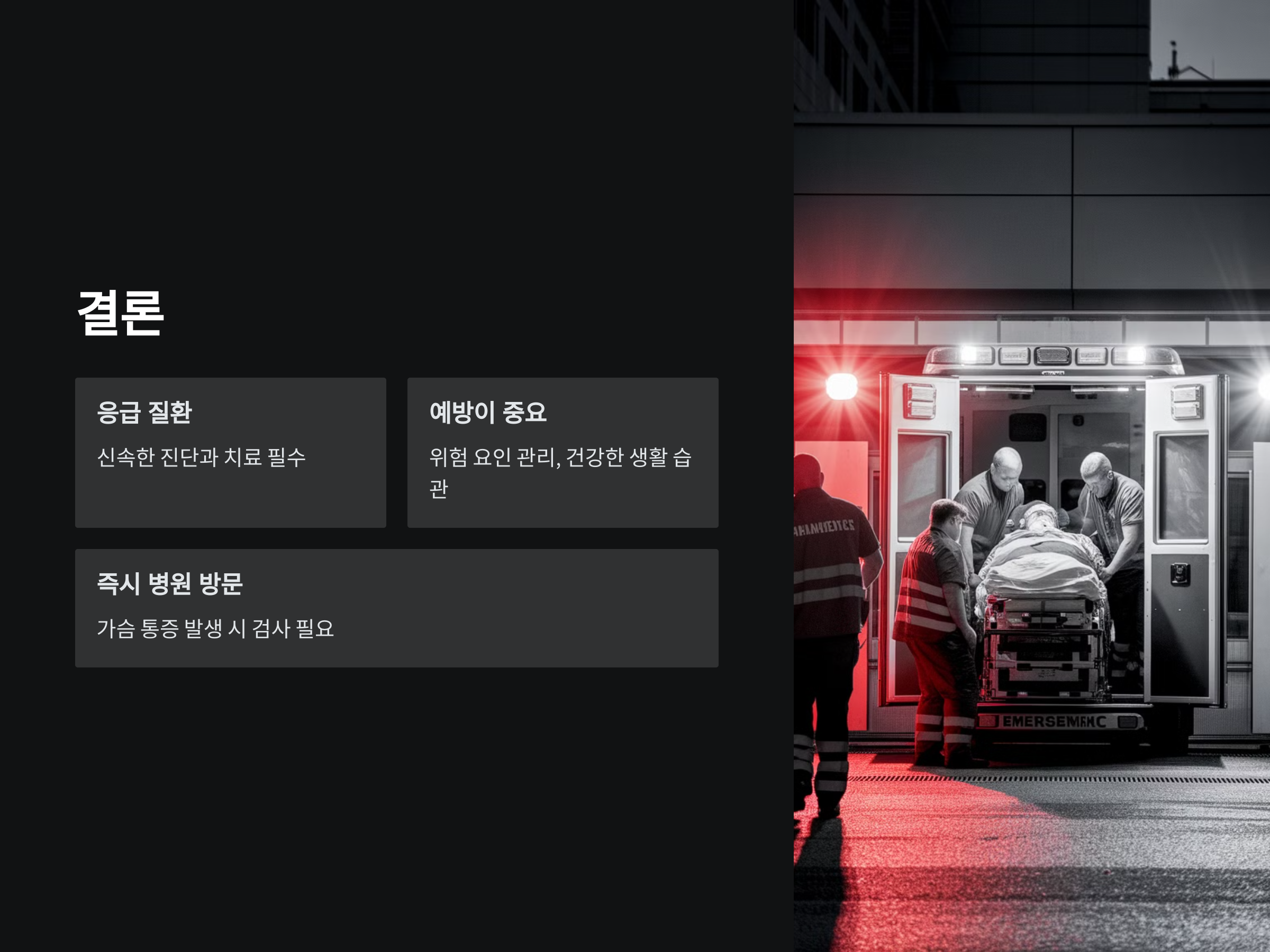 대동맥 박리는 극심한 가슴 통증을 동반하는 치명적인 응급 질환으로, 신속한 진단과 치료가 필수적입니다. 고혈압, 동맥경화 등 위험 요인을 미리 관리하고, 건강한 생활 습관을 유지하는 것이 예방의 핵심입니다. 가슴 통증이 발생했을 때 즉시 병원을 방문하여 검사를 받는 것이 가장 중요합니