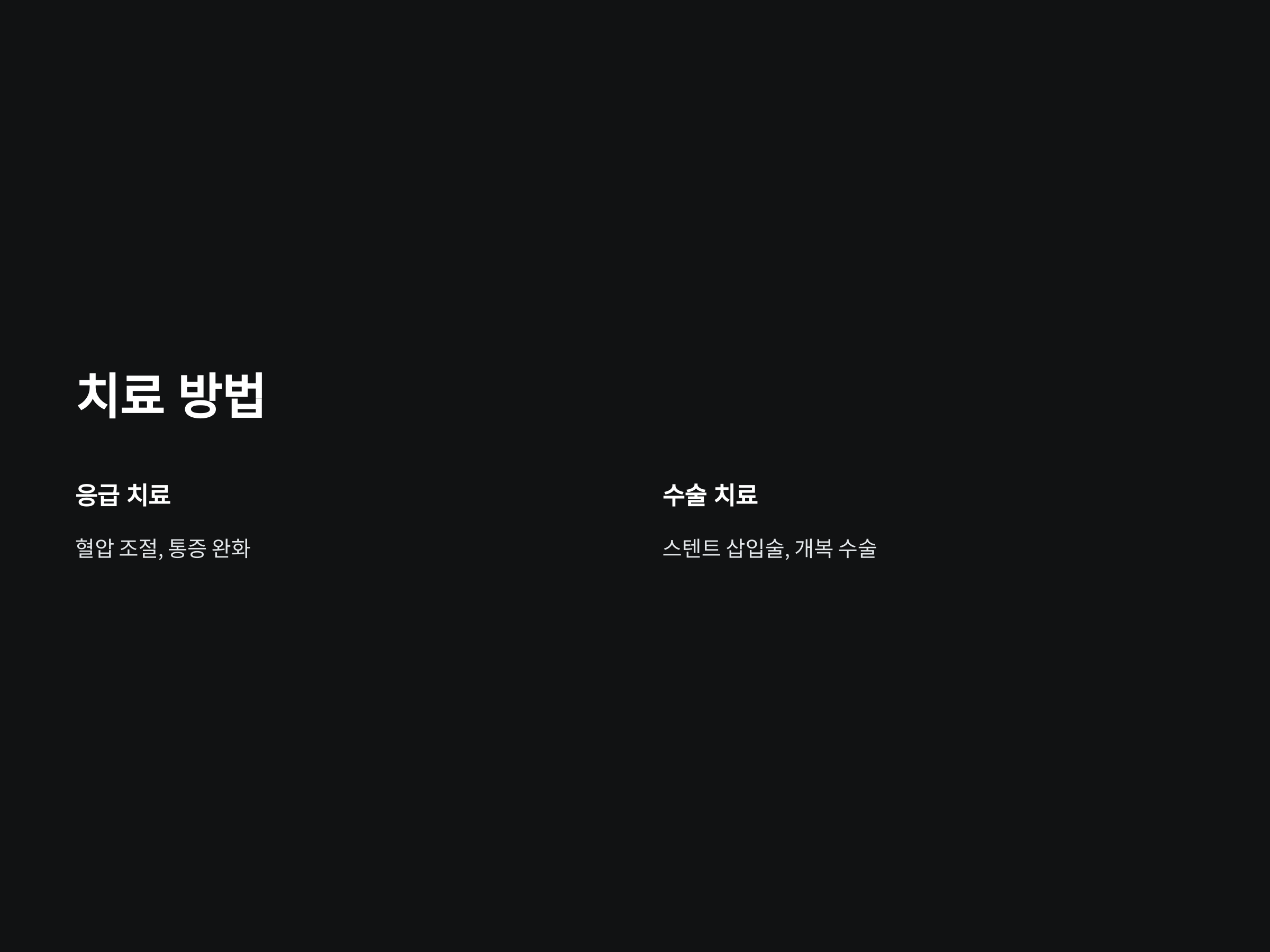 대동맥 박리는 박리 위치와 중증도에 따라 치료법이 결정됩니다.