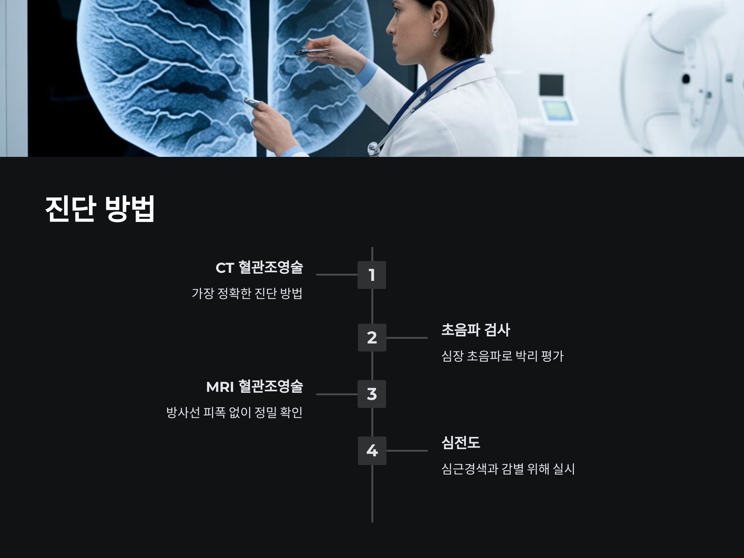 - CT 혈관조영술(CTA): 대동맥 박리를 진단하는 가장 정확한 검사 방법입니다.