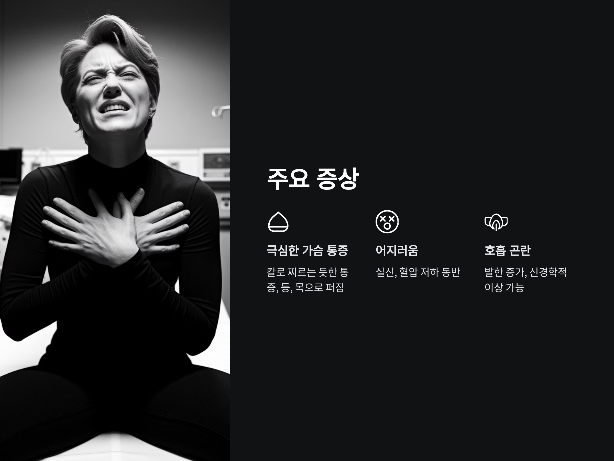 대동맥 박리는 초기 증상이 심각하며 급격히 진행될 수 있습니다. 대표적인 증상은 다음과 같습니다.