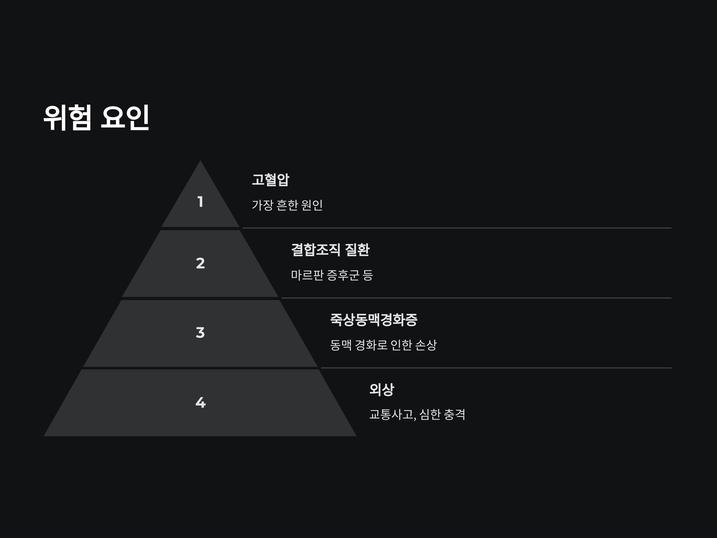 - 고혈압: 가장 흔한 원인으로, 대동맥 벽에 지속적인 압력을 가해 약화를 초래합니다.