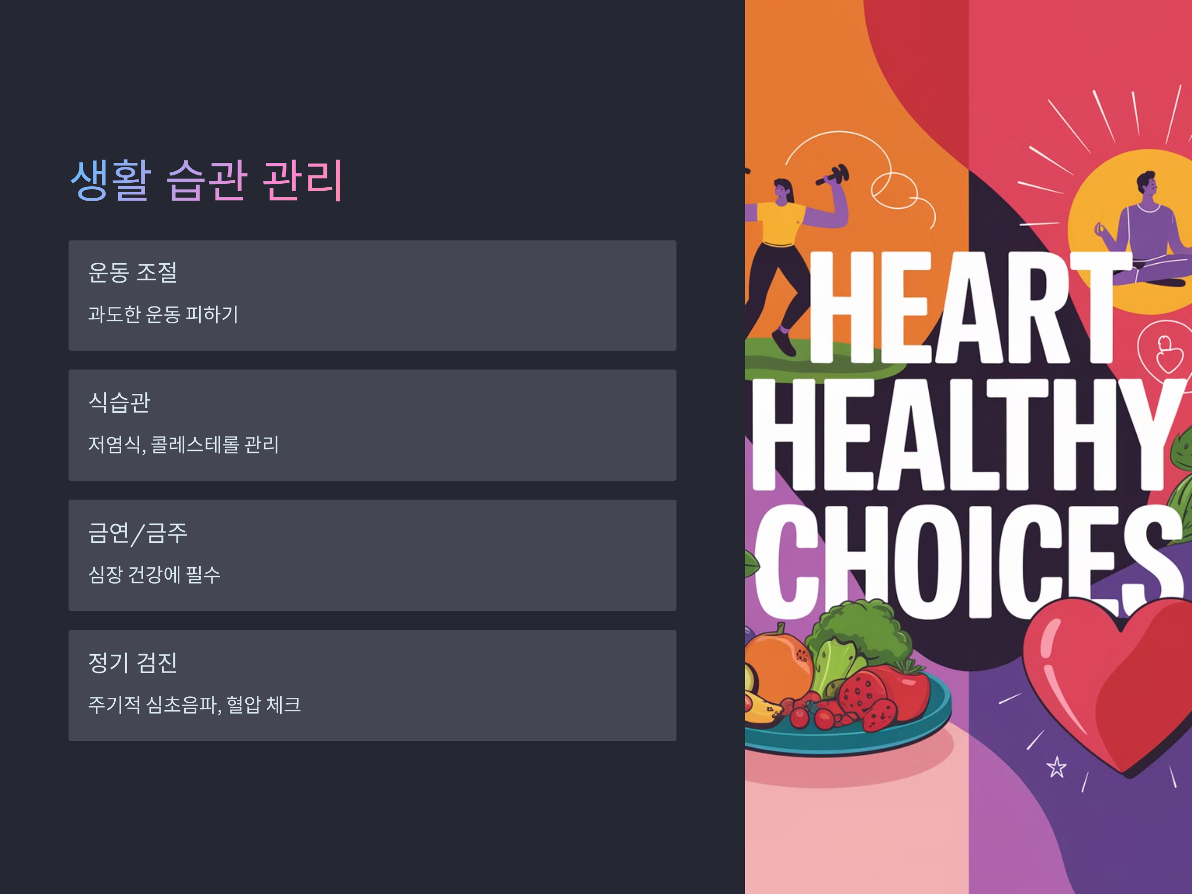 - 금연 및 금주: 흡연과 과음은 심장 건강에 악영향을 미치므로 반드시 피해야 합니다.