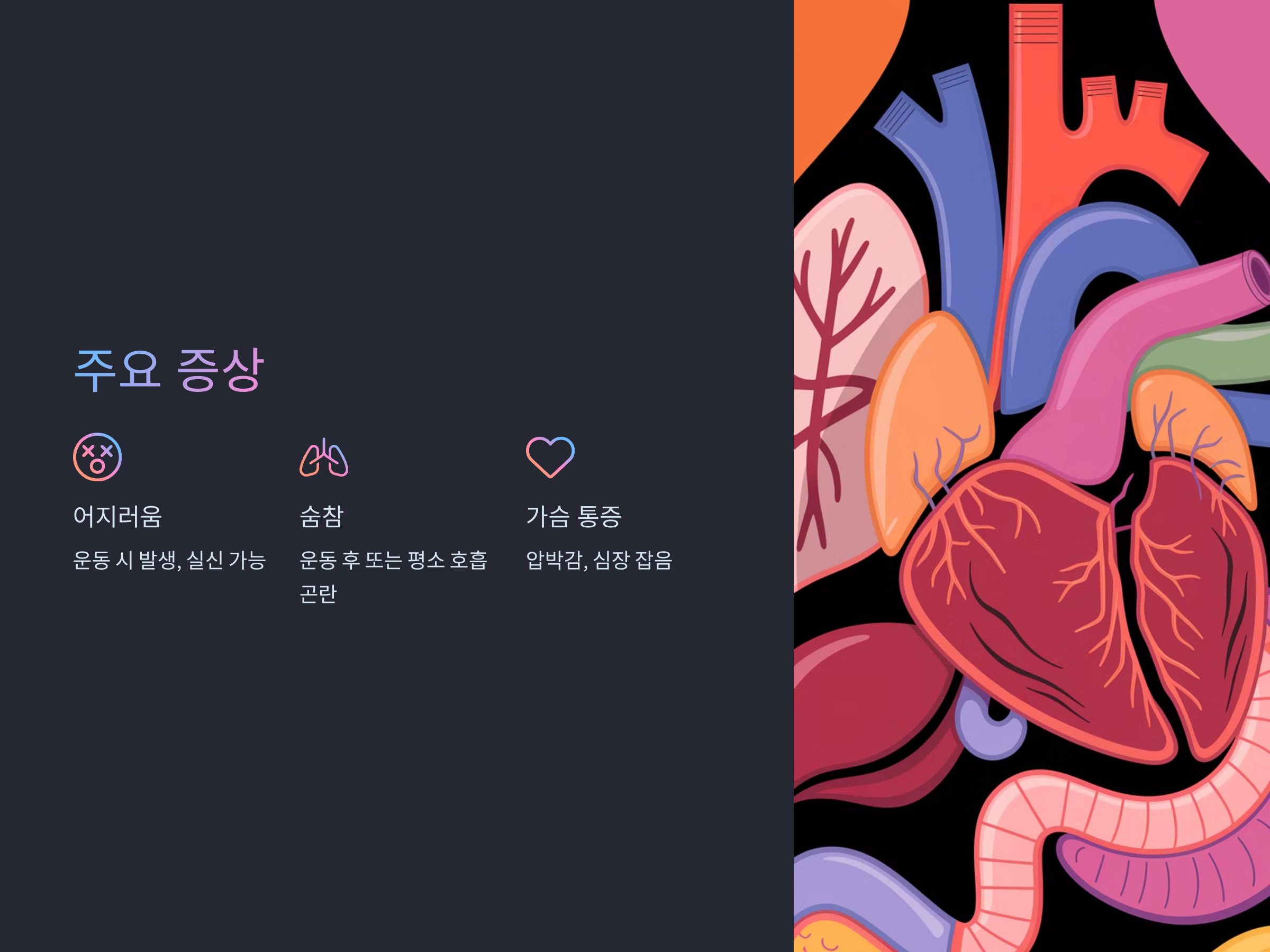 - 이로 인해 가슴 통증(협심증)이나 심부전 증상이 나타날 수 있습니다.