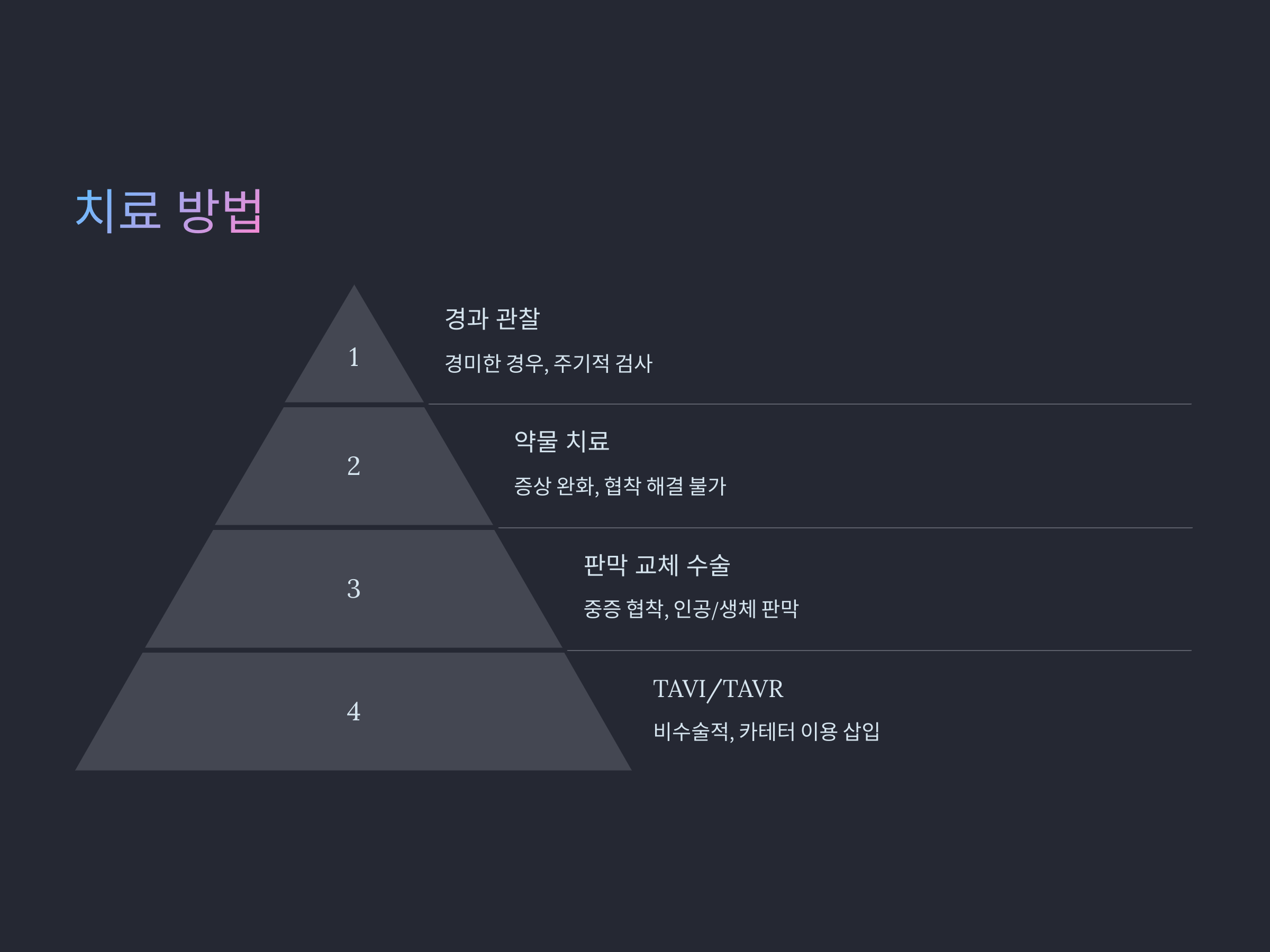 - 중증 협착 환자의 경우 인공 판막 또는 생체 판막을 이용한 교체 수술이 필요합니다.