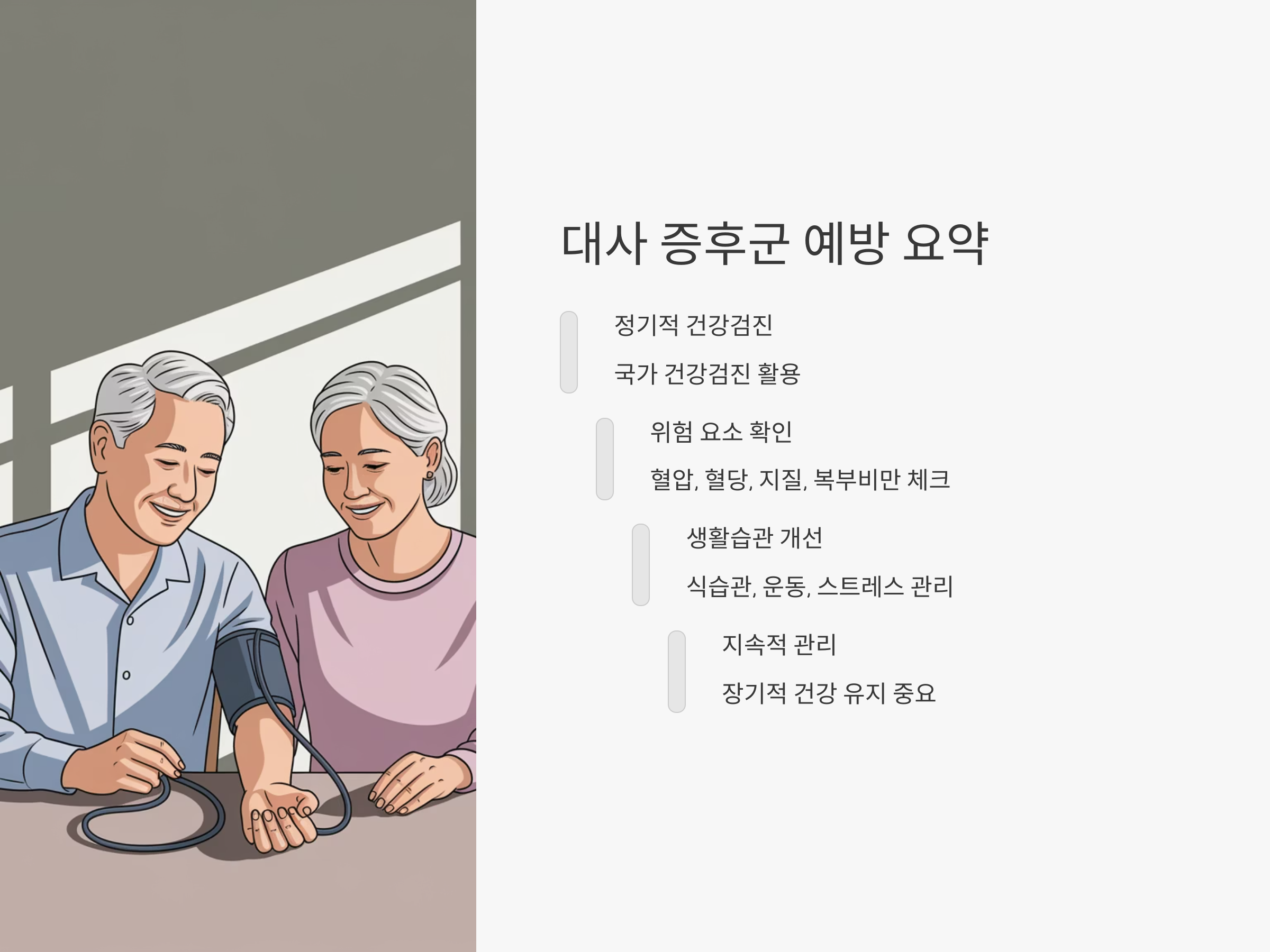 대사 증후군은 여러 가지 위험 요소가 복합적으로 작용하는 질환이기 때문에, 예방과 관리가 매우 중요합니다. 국가 건강검진을 통해 대사 증후군의 위험 요소를 조기에 발견하고, 이를 바탕으로 건강한 생활습관을 유지하는 것이 필수적입니다. 정기적인 검진과 함께 건강한 식습관과 운동을 병행하면, 대사 증후군을 예방할 수 있습니다.