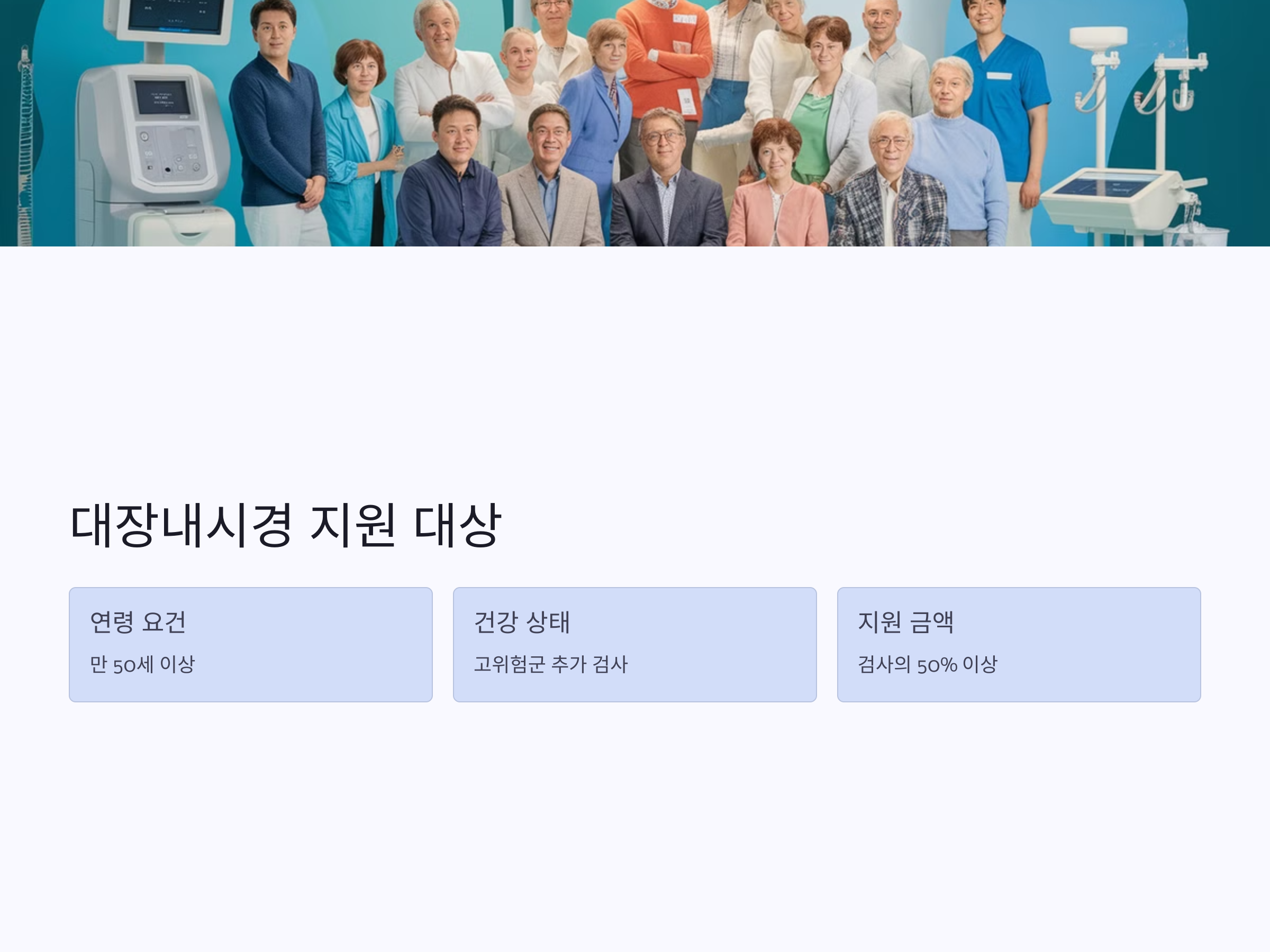 대장내시경 검사는 50세 이상을 대상으로 국가 건강검진 항목에 포함되어 있으며, 해당 연령대라면 건강보험공단을 통해 지원을 받을 수 있습니다.